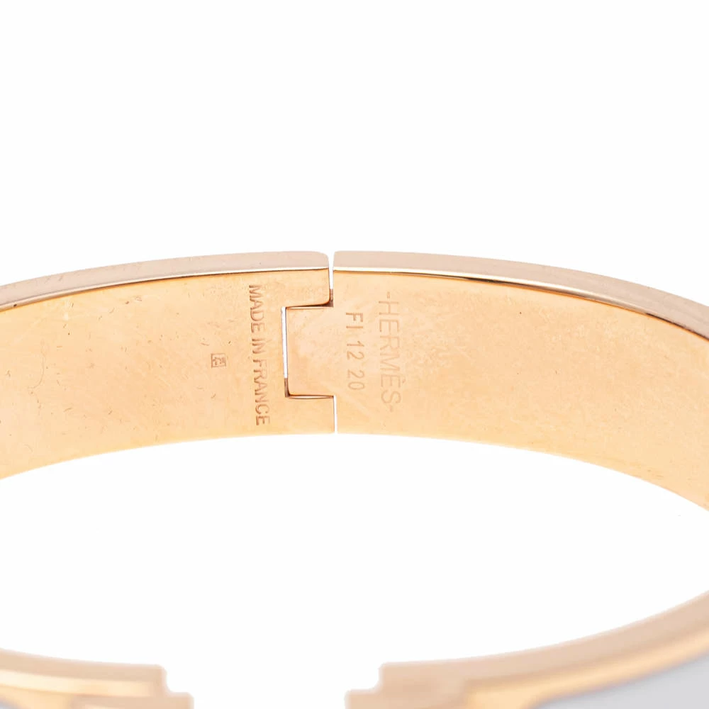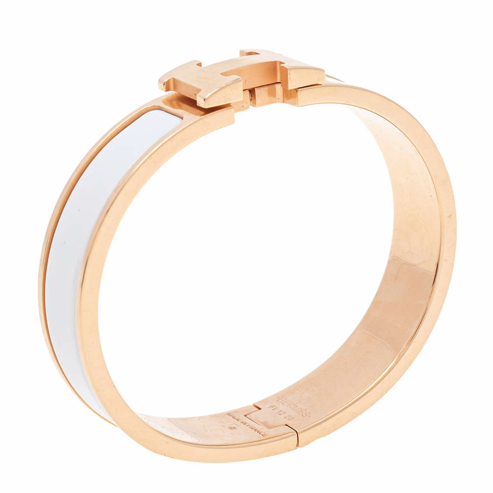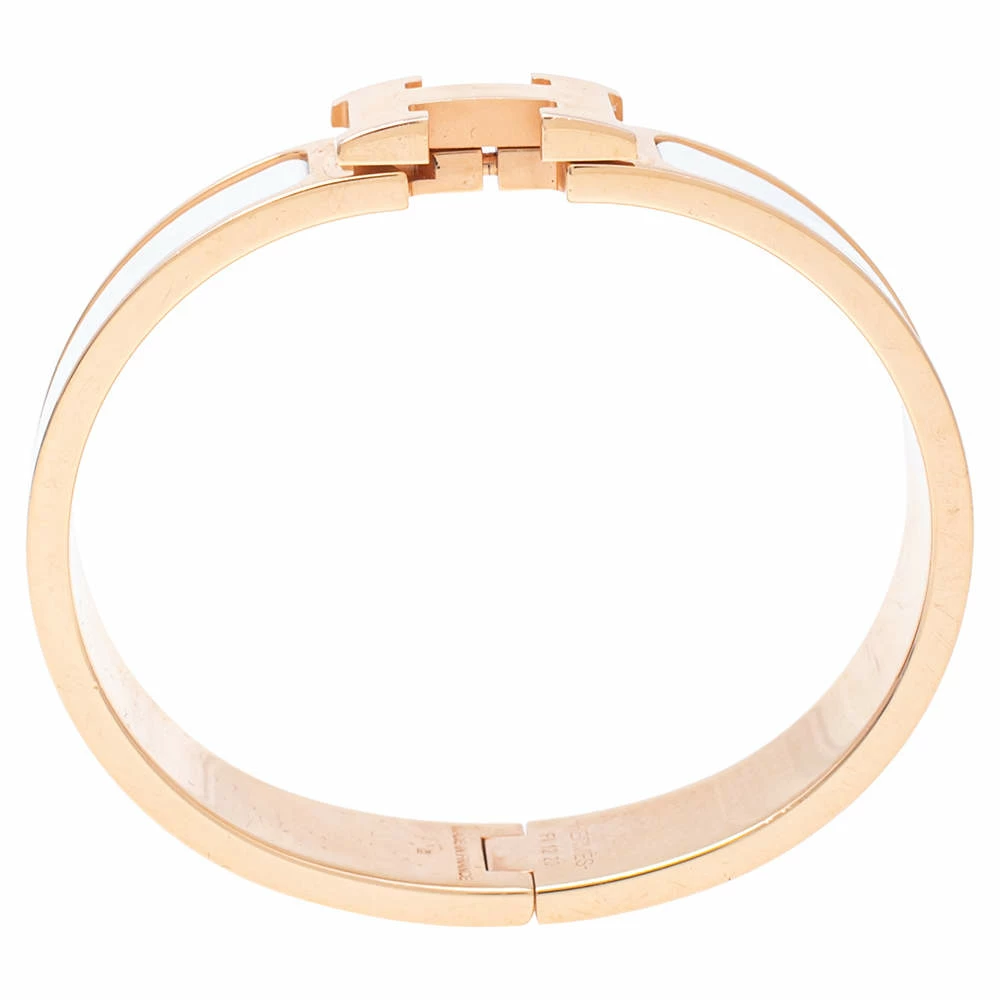 Adorn your wrist with this stunner of a bracelet from Hermes. The piece is from their Clic H collection, and it has been crafted from rose gold-plated metal and designed with white enamel. This bracelet is complete with the iconic H to the front.