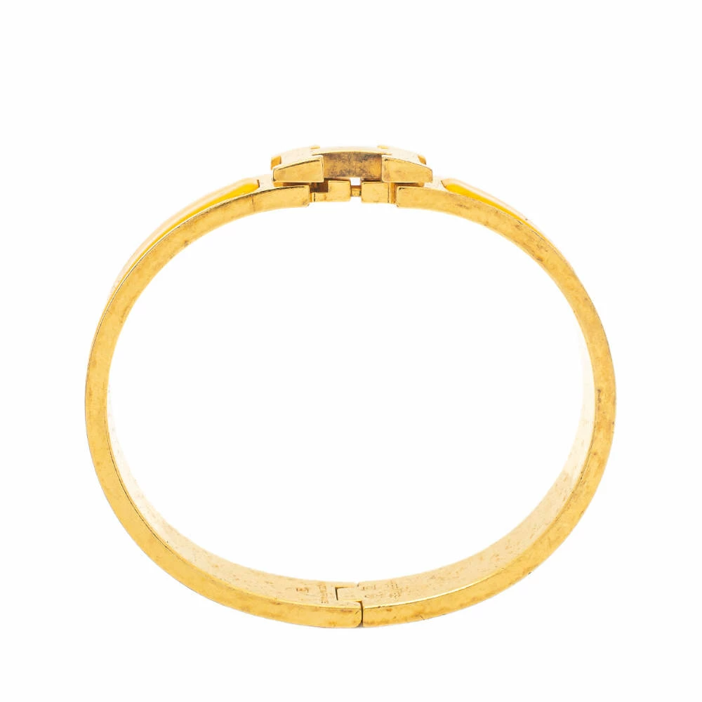 This bracelet embodies Hermès’ elegant craftsmanship with its gold-plated metal body and yellow enamel inlay. Featuring the iconic H logo of the fashion house at the front, this bracelet is the accessory to buy today!