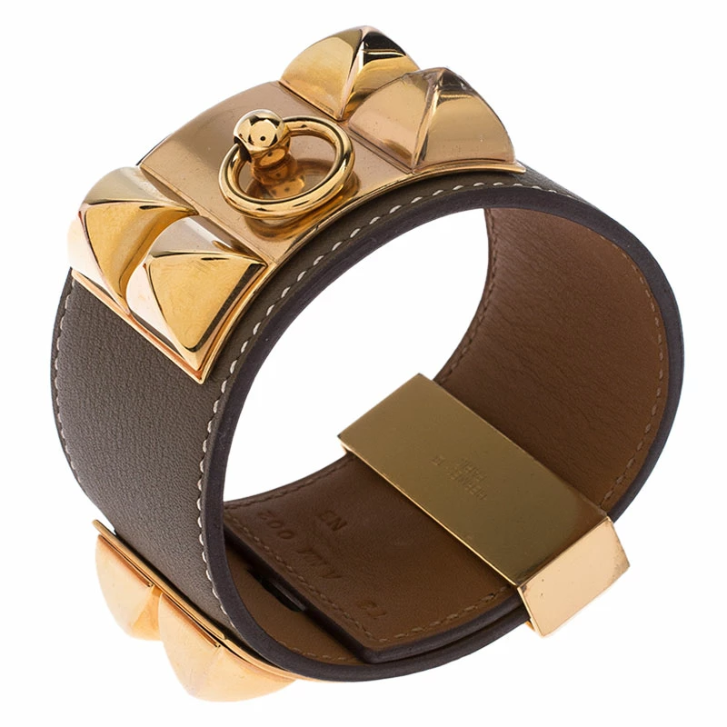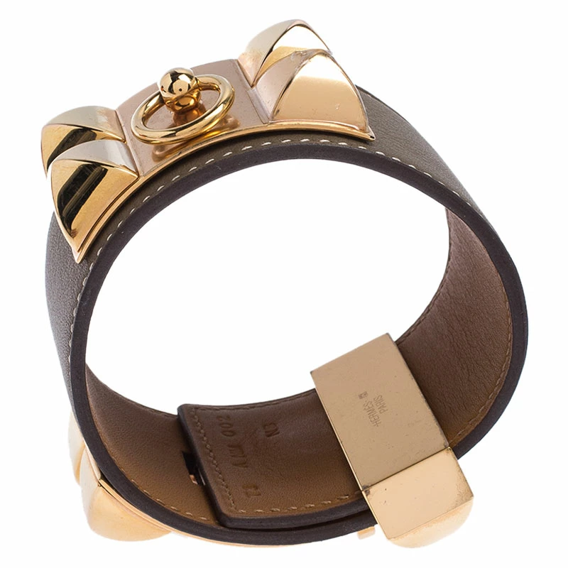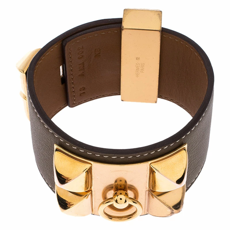 Exuding a downtown, punk vibe, this instantly recognizable bracelet is from the signature Collier de Chien collection of Hermès. The bracelet, made of olive green leather, is adorned with the iconic Collier de Chien motif in gold-plated metal featuring pyramid studs and a ring. It is completed with intricately crafted turn-lock closure. This bold creation is a testimonial to the dog collar made by the label in 1923, paving ways for various design iterations.
