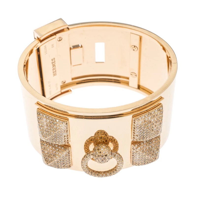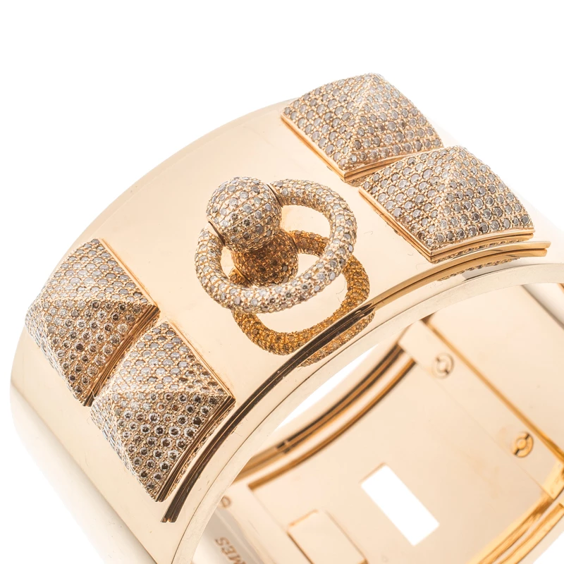 The story of how the Collier de chien designs came to life is an interesting one. It began in the early years of the 20th century when the luxury house of Hermès designed a dog collar for one of their clients. Its design had a central ring for the leash and pyramid studs. The custom-made piece led to many more orders by dog owners. A few years later, as per the request of couturière Marie Gerber, a belt of the collar was created. Gradually, the cuff bracelet was fashioned and created, appearing in a variety of versions for all women to wear. This version here is crafted from 18k Rose Gold, and it has the iconic detailing of studs and the central ring that moves freely. As an extra touch of luxury, there are 999 round brilliant cut diamonds decorated on the signature pyramid studs and on the ring, totalling to approximately 4.40 ct. Long hours of precise workmanship has gone into creating this wonder that needless to say, it deserves to be in the wrists of an admirer of fine art like yourself.