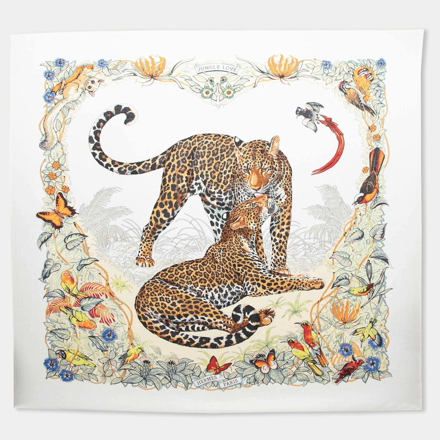 This scarf from the House of Hermès is a beautiful accessory that you can use to elevate your attire. Fashioned in cream cashmere and silk fabric, this scarf flaunts a multicolored Jungle Love print and a length of 138 cm. Update your accessory collection with this scarf today!