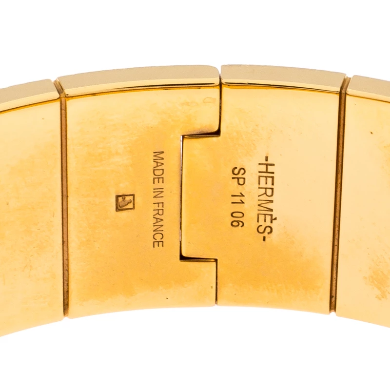 Beautify your wrist with this stunner of a bracelet from Hermes. The piece has been crafted from gold-plated metal and designed with gorgeous enamel work. This bracelet is completed with the iconic label on the inside of the band.