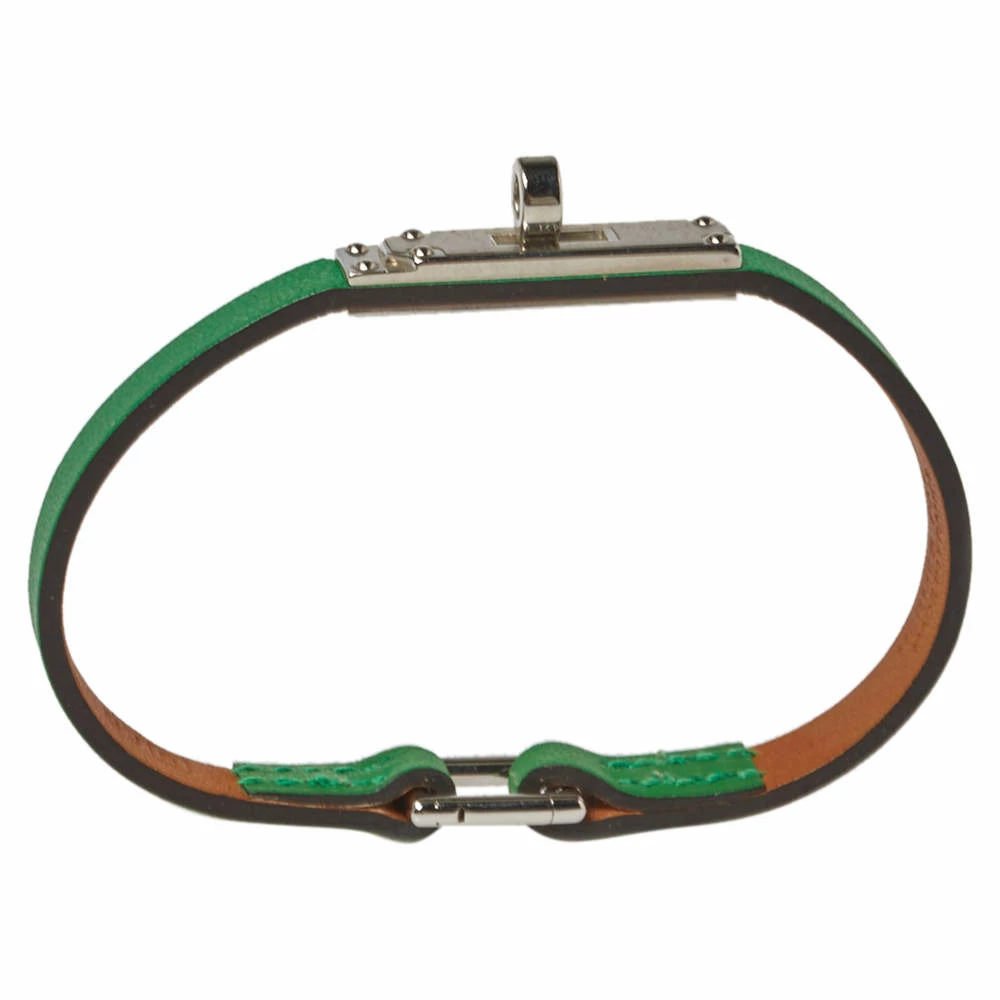 This Hermès bracelet is a chic accessory that can be paired with everything, from casuals to evening outfits. Made from leather, it is beautified with a Kelly twist closure in palladium-plated metal. The green bracelet wraps around your wrist.