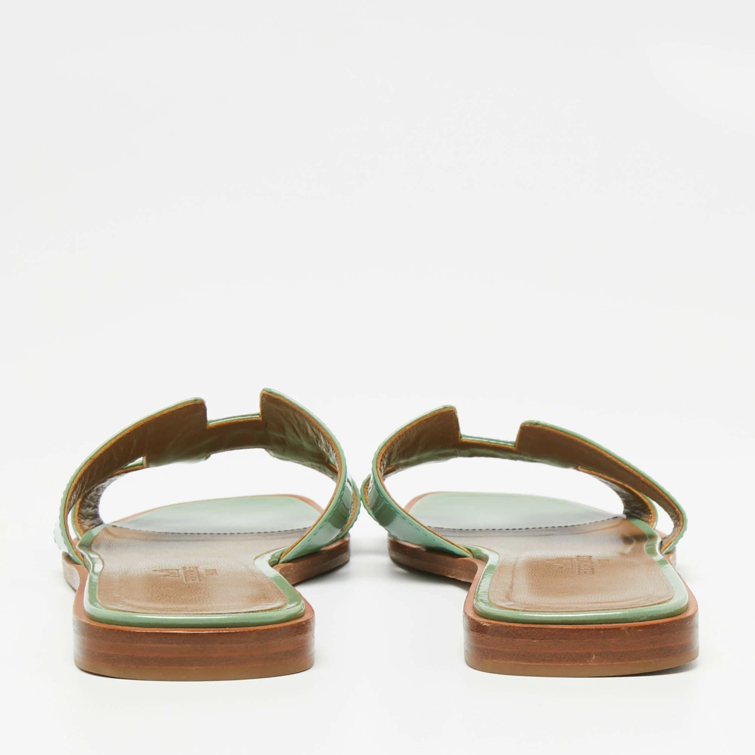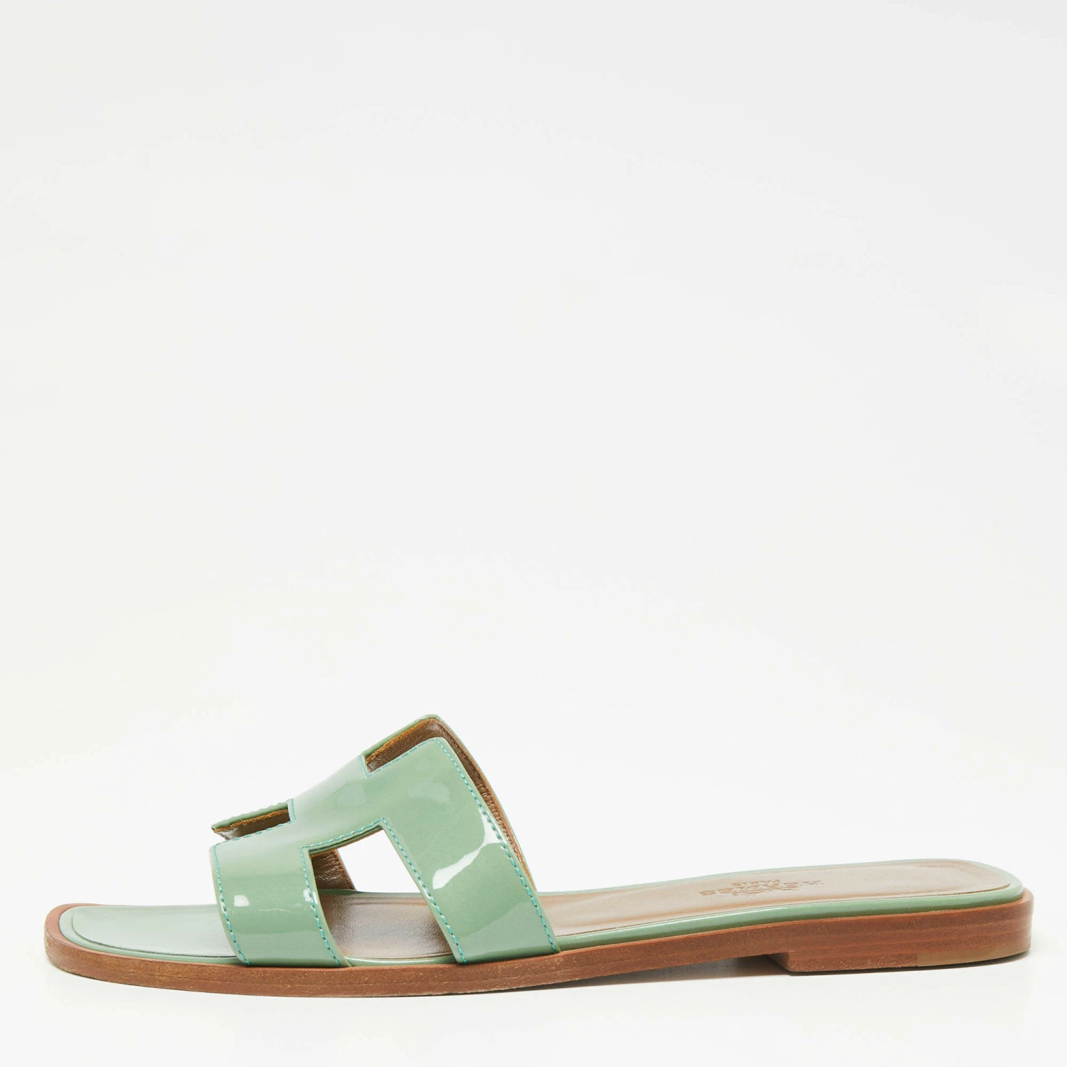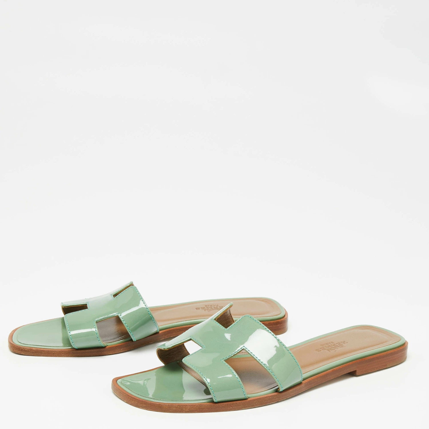 Put your best foot forward this season in these pretty Hermès flats. These green Oran slides have been crafted from patent leather in Italy and they feature the iconic H on the vamps as well as insoles meant to provide comfort at every step. These sandals are sure to attract admirers!