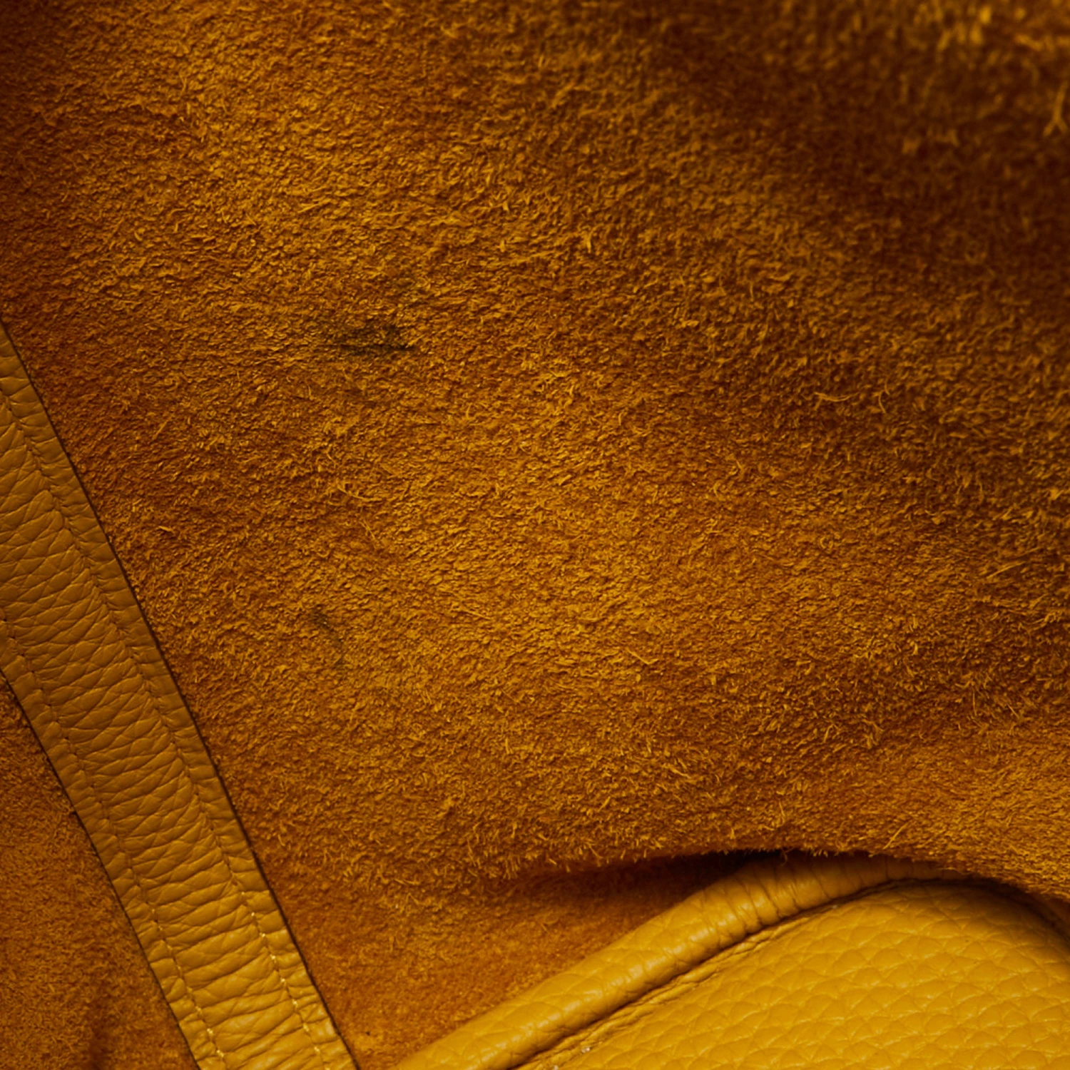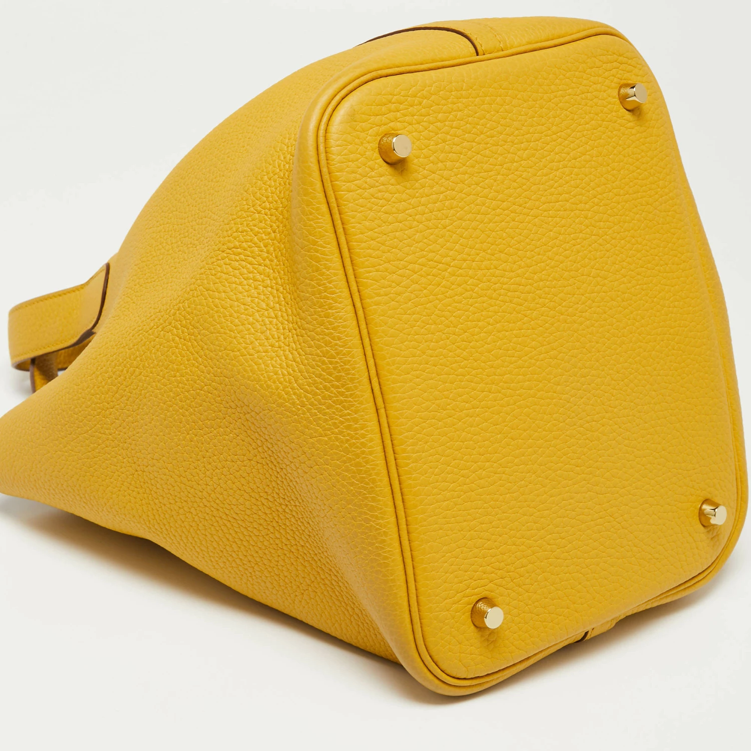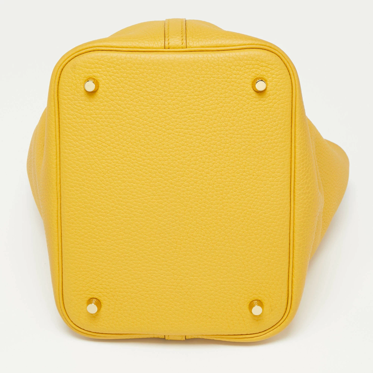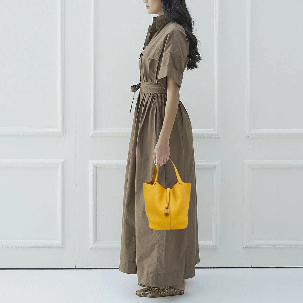 Wonderfully crafted from Jaune Ambre Togo leather, this Hermes Picotin Lock 22 is a creation for those who love a blend of luxury and style. It comes in a grand color and it sits in a bucket-like shape with two handles and a leather interior. Armed with protective metal feet as a finishing touch, this pre-owned Picotin will be a sweet style companion.