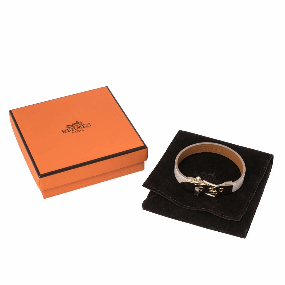 Another fabulous offering by Hermès is this Java 10. Designed to sit comfortably around your wrist, this bracelet has been crafted from quality white leather and decorated with a gold-plated metal buckle on the front.