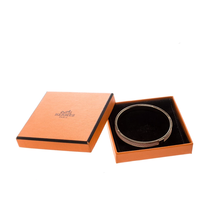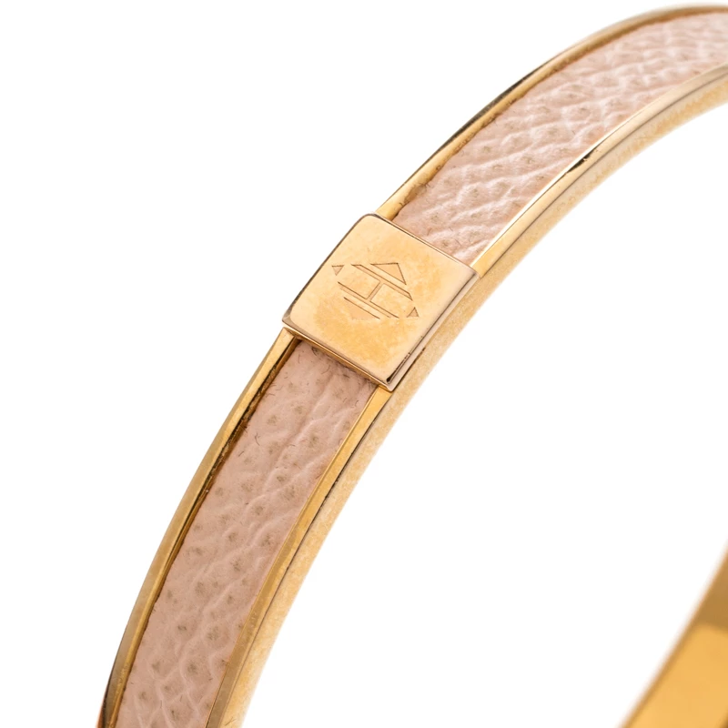 Beautifully sculpted from gold-tone metal, this Hermès bangle bracelet is a choice of a modern woman. It carries a simple design with pink leather running along the center and the brand logo neatly engraved on it. This bracelet is classy and a prized buy.