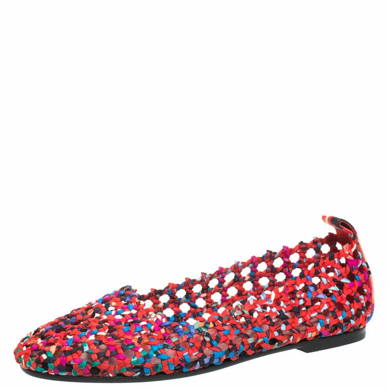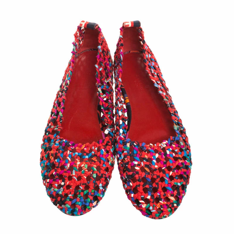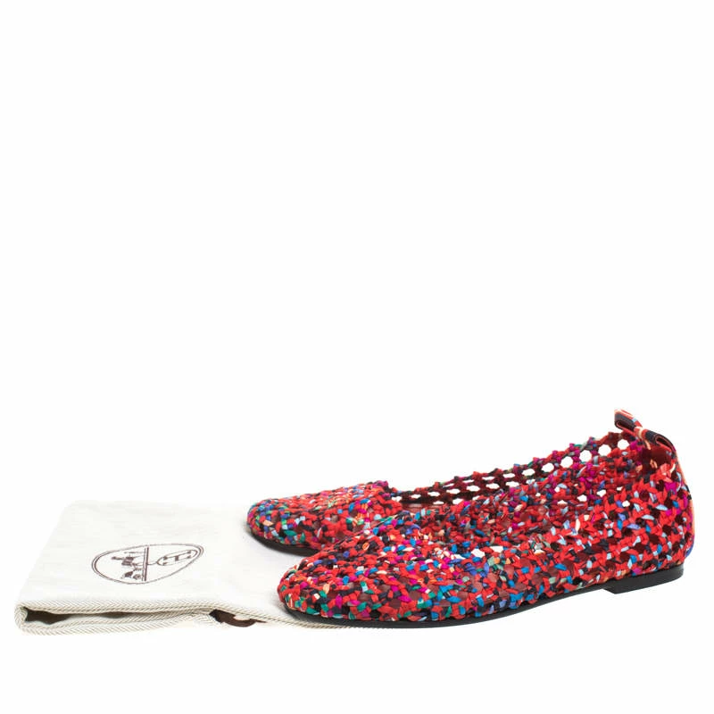 These magnificent ballet flats from Hermes are designed to complement your entire outfit. Crafted in Italy, they are made from luxurious silk. They flaunt lovely multicolored hues and feature a woven pattern throughout. These are styled with round toes, silk lining, leather insoles and soles. They are stylish and comfortable.