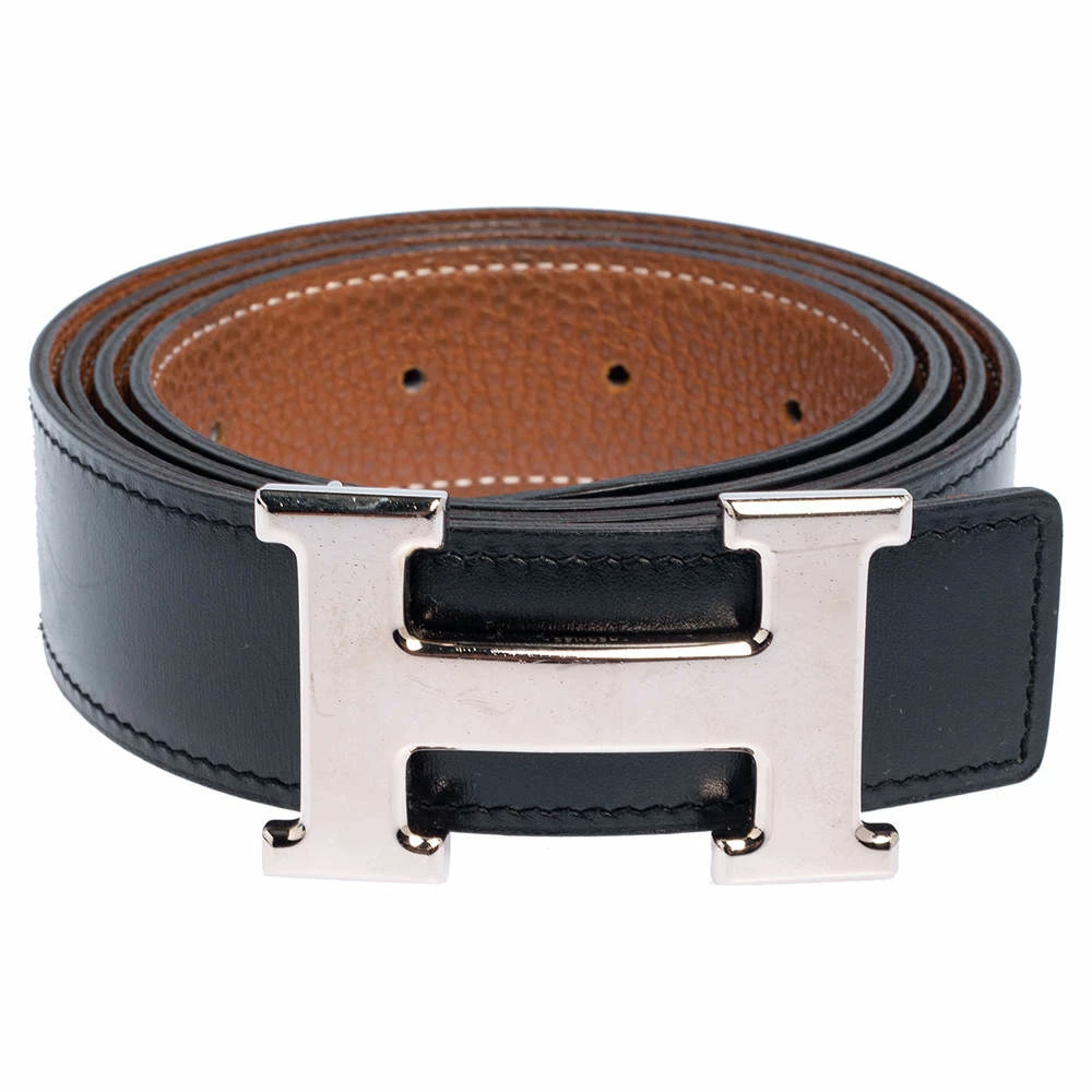 A celebrated design from the range of accessories by Hermès is the reversible belt. Here, we have the belt made from Box and Togo leather with a black hue on one side and brown on the other. It is finished with a silver-finished H buckle.