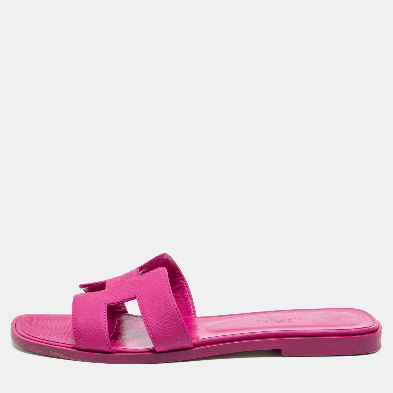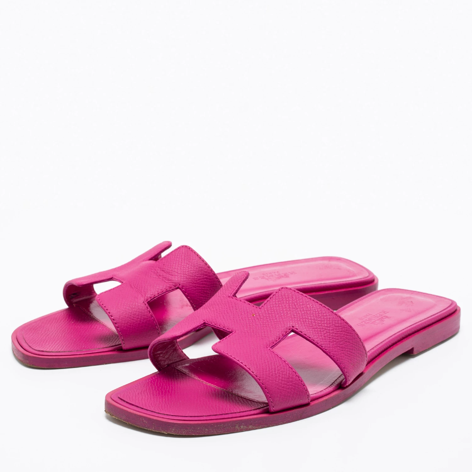 Add the iconic Hermès Oran sandals to your shoe collection with this pair. These pink-hued flats have been crafted in Italy, and they feature the iconic H on the vamps and lined insoles in leather to provide comfort at every step.