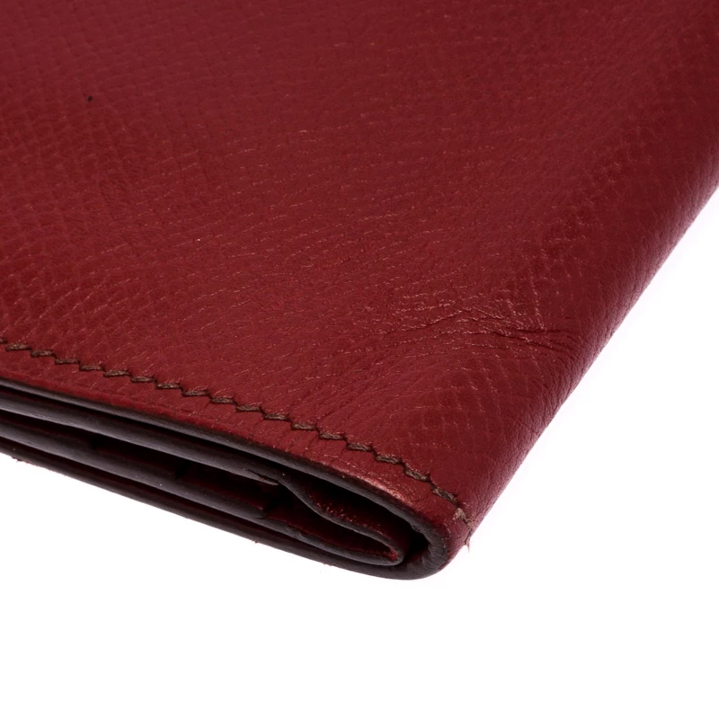 Luxuriously crafted by the experts at Hermes, this stunning Bearn wallet is a must-have accessory for fashion lovers. Crafted in red leather, this wallet features a silver-tone H where the strap can be tucked in and opened to reveal leather-lined compartments and slots for your cards and cash.