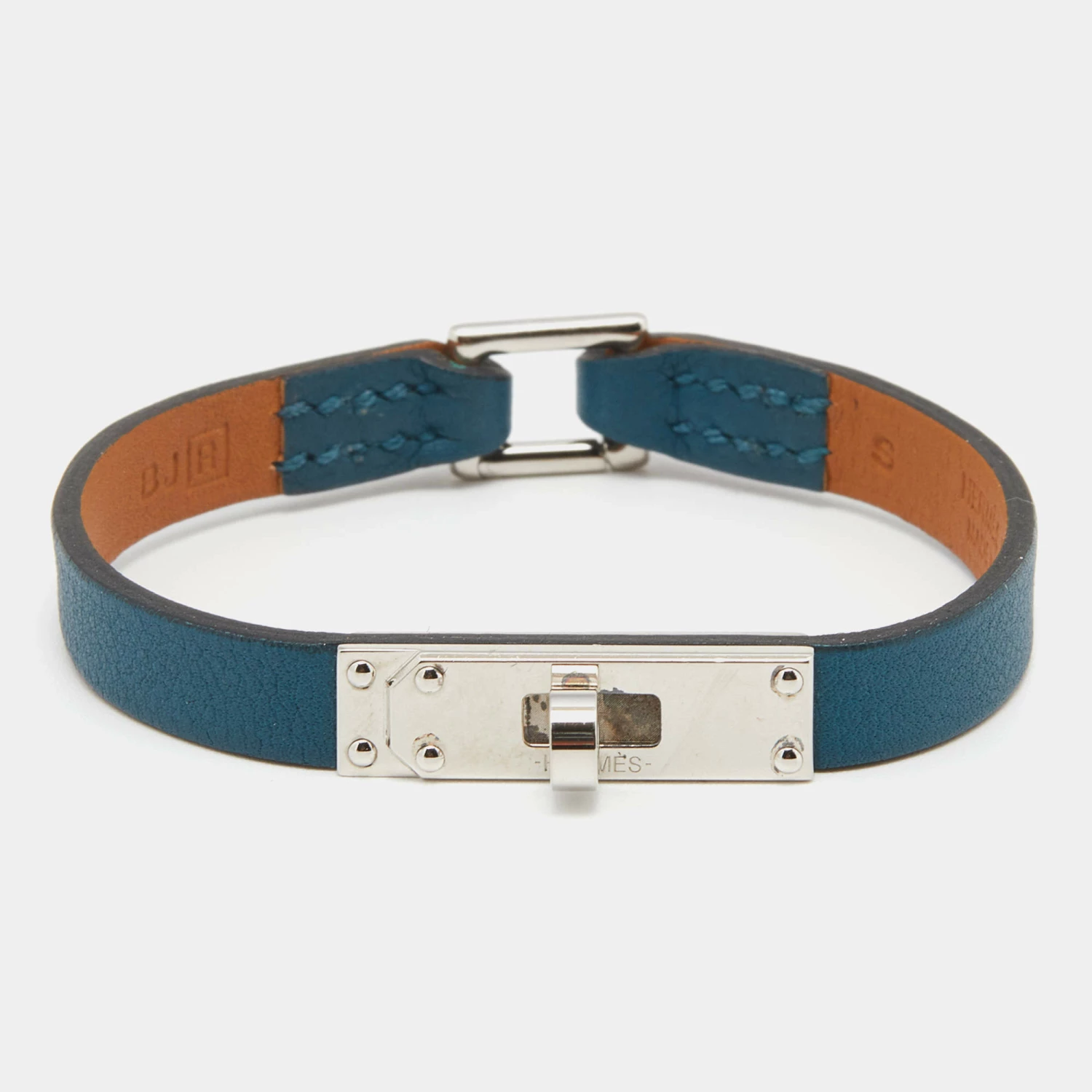 Hermès’ Kelly bracelet has been made from teal blue leather and embellished with a palladium-plated Kelly motif. It looks great solo or even when stacked with other colors.