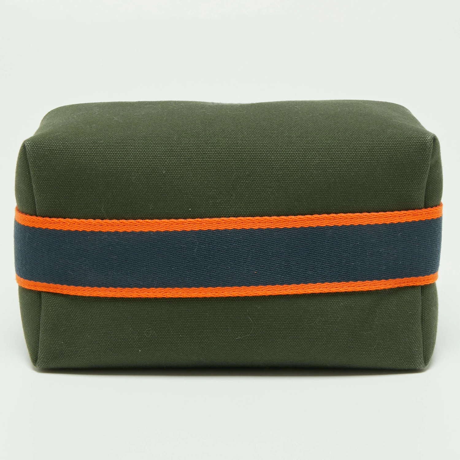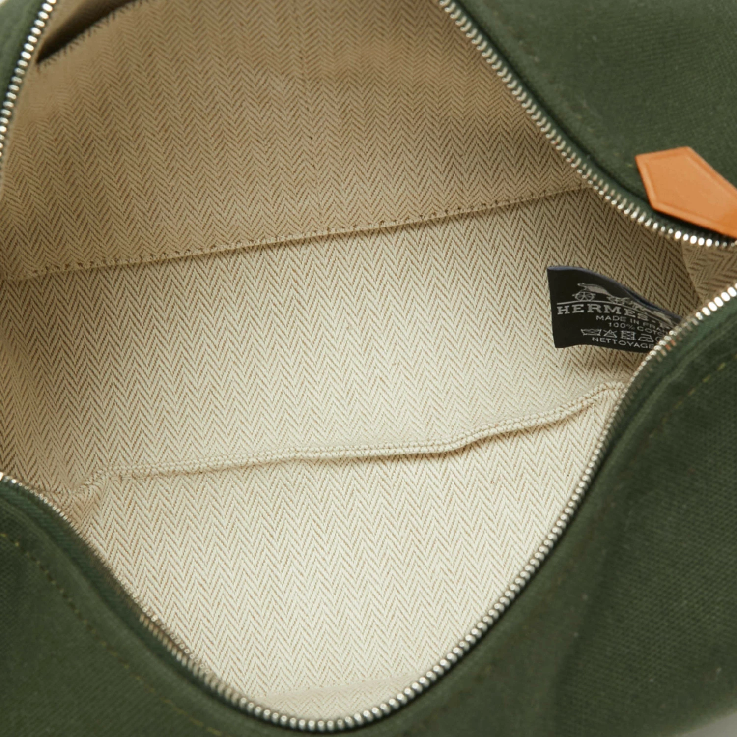The beauty of this Hermès Bride-a-Brace case lies in its striking and versatile design. Created from canvas, it is added with a bi-colored handle that can be buttoned inward and the logo detailing on the front offers it a touch of exclusivity. The lined interior of the bag is secured by a zipper closure at the top.