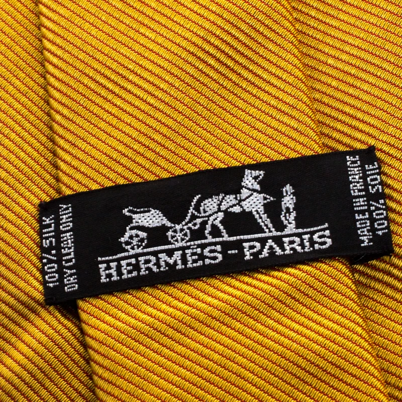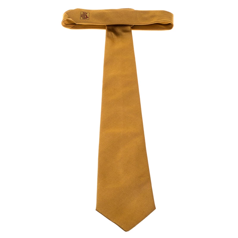 Cut from quality silk, this mustard yellow Hermès tie features stripes in jacquard all over. The piece is complete with the brand label on the keeper loop at the back. Look smart by pairing it with plain shirts.