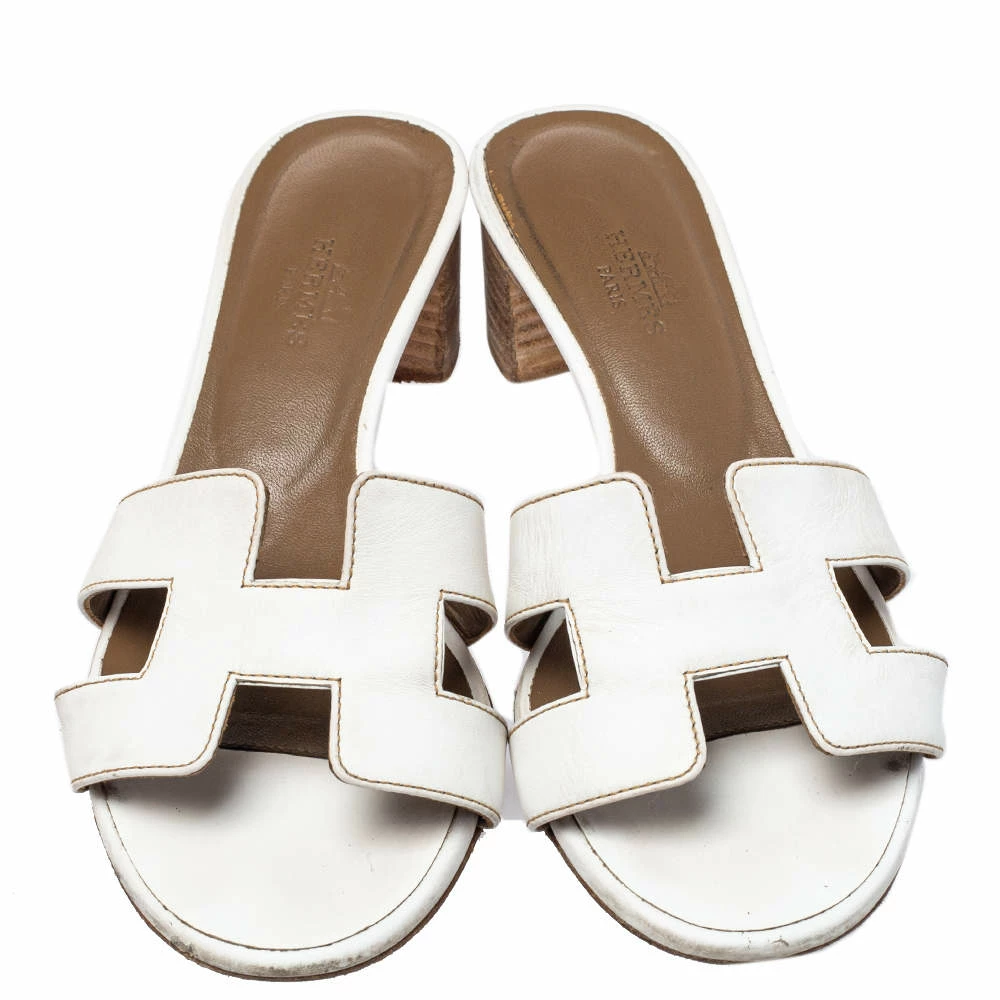 A seamless blend of luxury, comfort, and class is what you get when you slide your feet into these Hermès sandals. Crafted from white leather, they feature the signature H-shaped straps on the front and are set on comfortable block heels. These sandals can be easily styled with both casual and formal outfits.