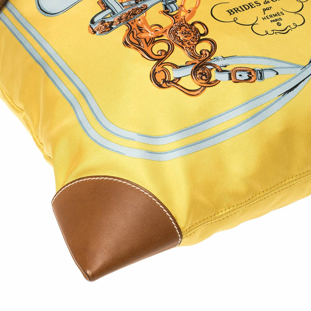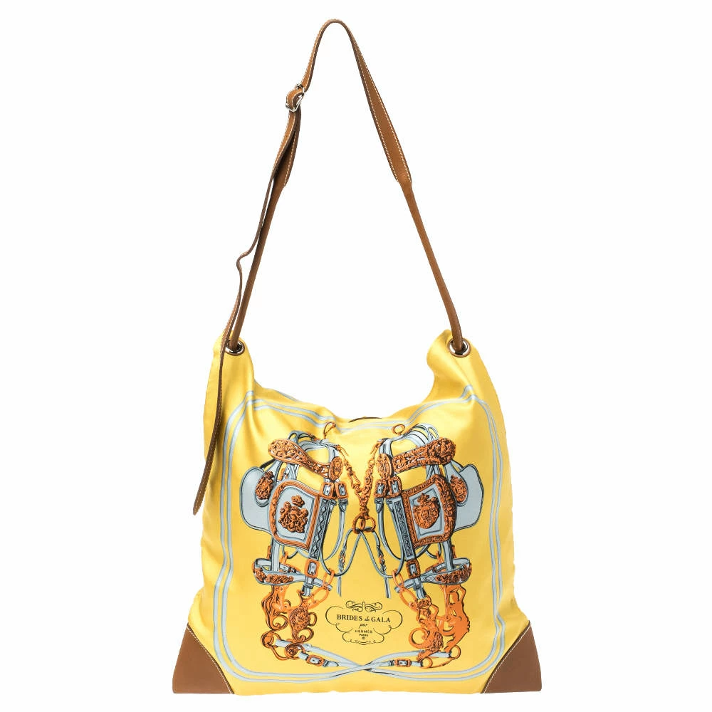 Brides de Gala is a classic design that features dual magnificent bridles. It was first created by Hugh Grygkar in 1957 and was re-edited many times. This Silky City iteration features a similar design and is made from yellow-hued silk with leather trims on the edges. It comes with an adjustable shoulder strap and a zipper pouch. This bag retains its originality which makes it unique and instantly recognizable.