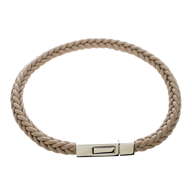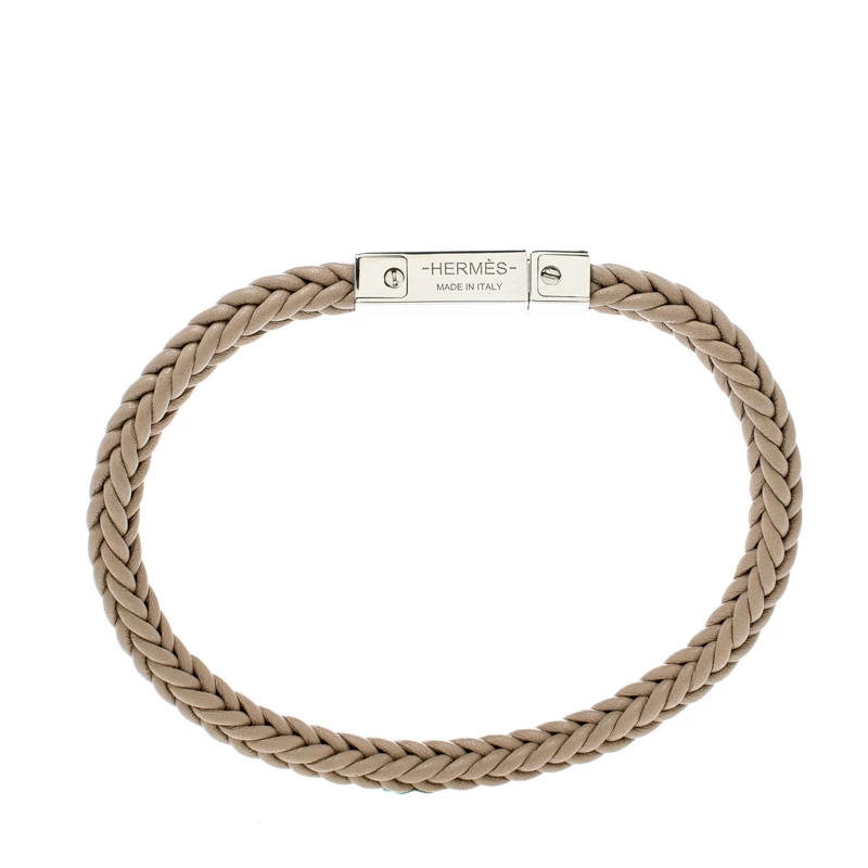 Sometimes, the simplest of designs are the most luxurious. This beautiful bracelet is by Hermes. It has a design of a woven leather strap that ends with a palladium-plated clasp engraved with the brand’s details.