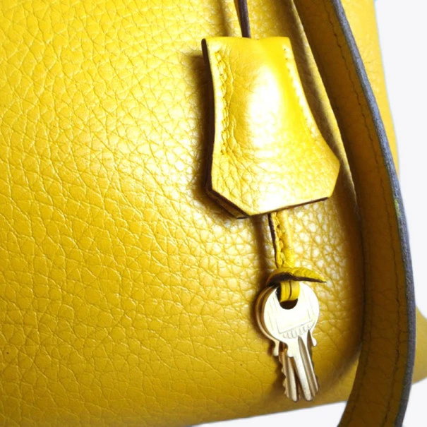 This version of the iconic and beloved Hermes Kelly 35 is crafted from Taurillon Clemence leather in bright yellow, that is detailed with a twist lock closure, leather clochette, double handles, shoulder strap, polished gold key and lock. The interior is lined with leather and features a zipped pocket and two patch pockets.