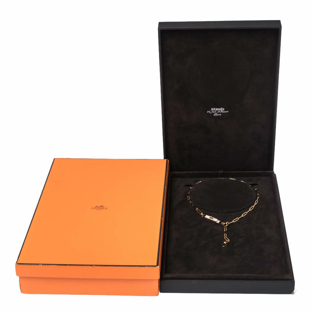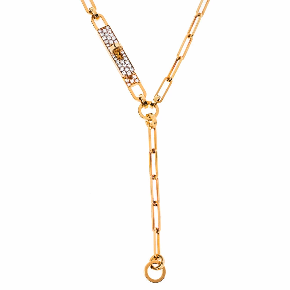 The Kelly is a name synonymous with Hermes. It is a symbol of their wondrous dedication to craftsmanship and classic style. First designed by Rober Dumas, the Kelly bag is known and coveted around the world. The lock of the bag, which is a turn lock, now appears in jewelry pieces as well. This beautiful necklace also carries the iconic Kelly lock. It comes crafted with 18K rose gold in a lariat silhouette and features the iconic lock decorated with shimmery diamonds, weighing approximately 0.62 ct. Brimming with lavish details and artistry, this wondrous creation deserves to be yours.