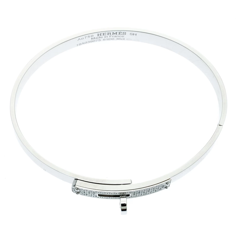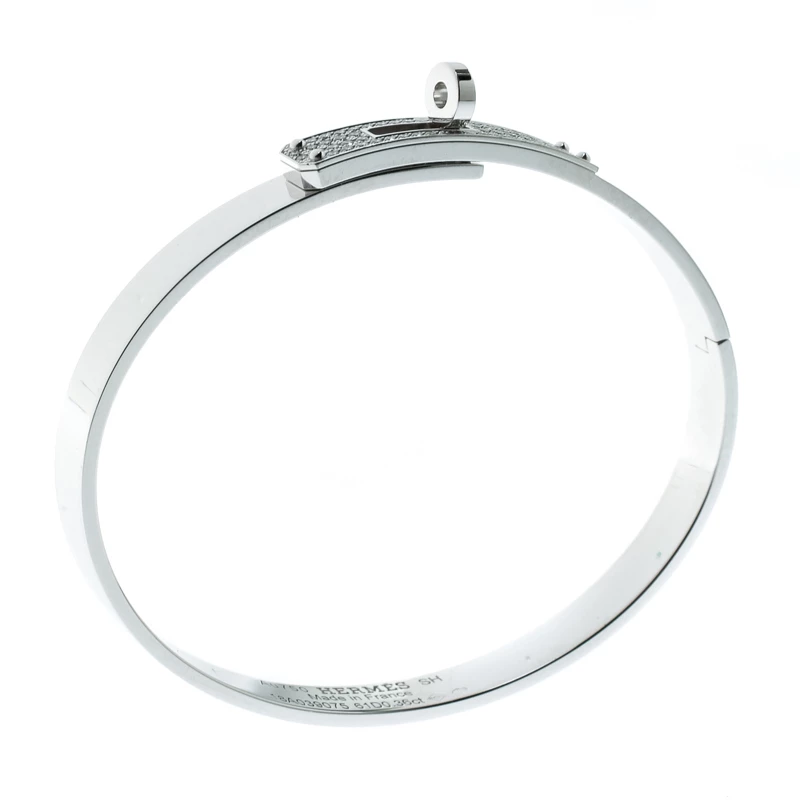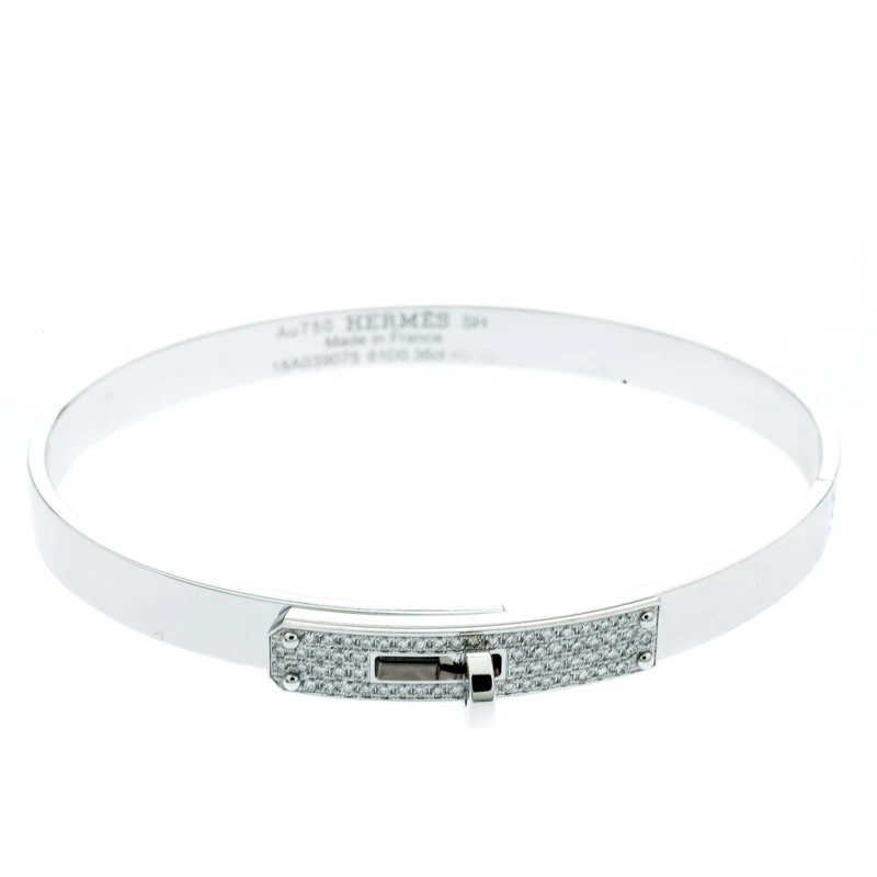 The Kelly is a name synonymous with Hermes. It is a symbol of their wondrous dedication to craftsmanship and classic style. First designed by Rober Dumas, the Kelly bag is known and coveted around the world. The lock of the bag, which is a turn lock, now appears in bracelets and jewellery. This narrow bangle bracelet also carries the iconic Kelly lock and it comes crafted with 18k white gold. The lock is breathtakingly decorated with 61 pieces of round brilliant cut diamonds and each one is placed artistically to catch the light at every angle. Brimming with lavish details and artistry, this wondrous creation deserves to be yours.