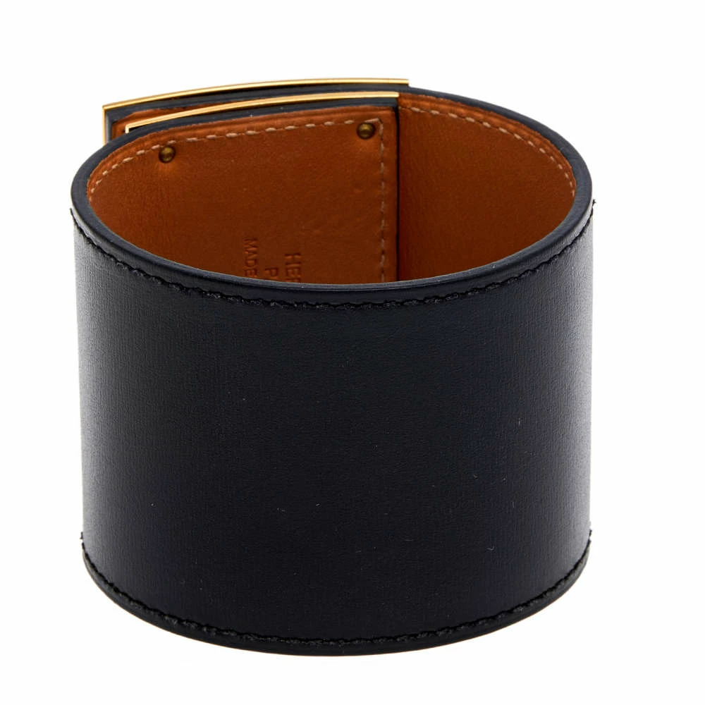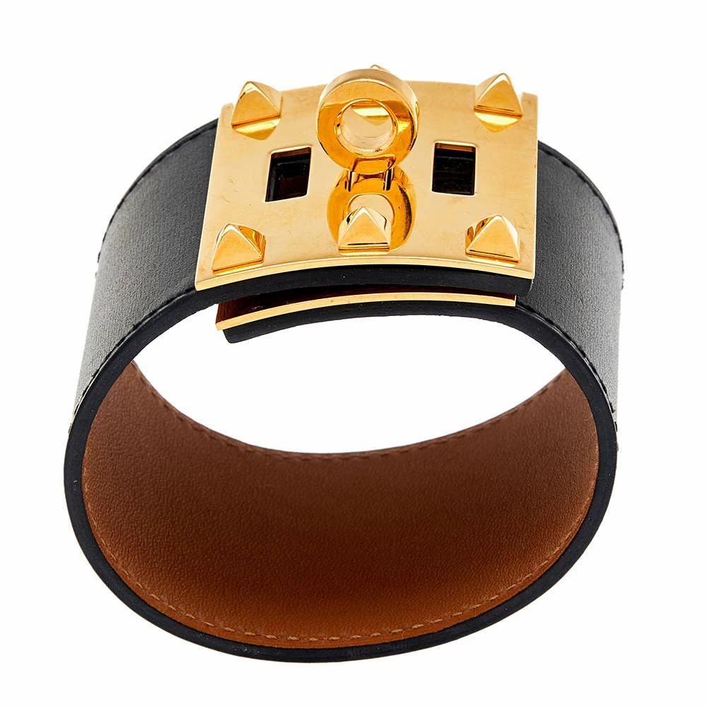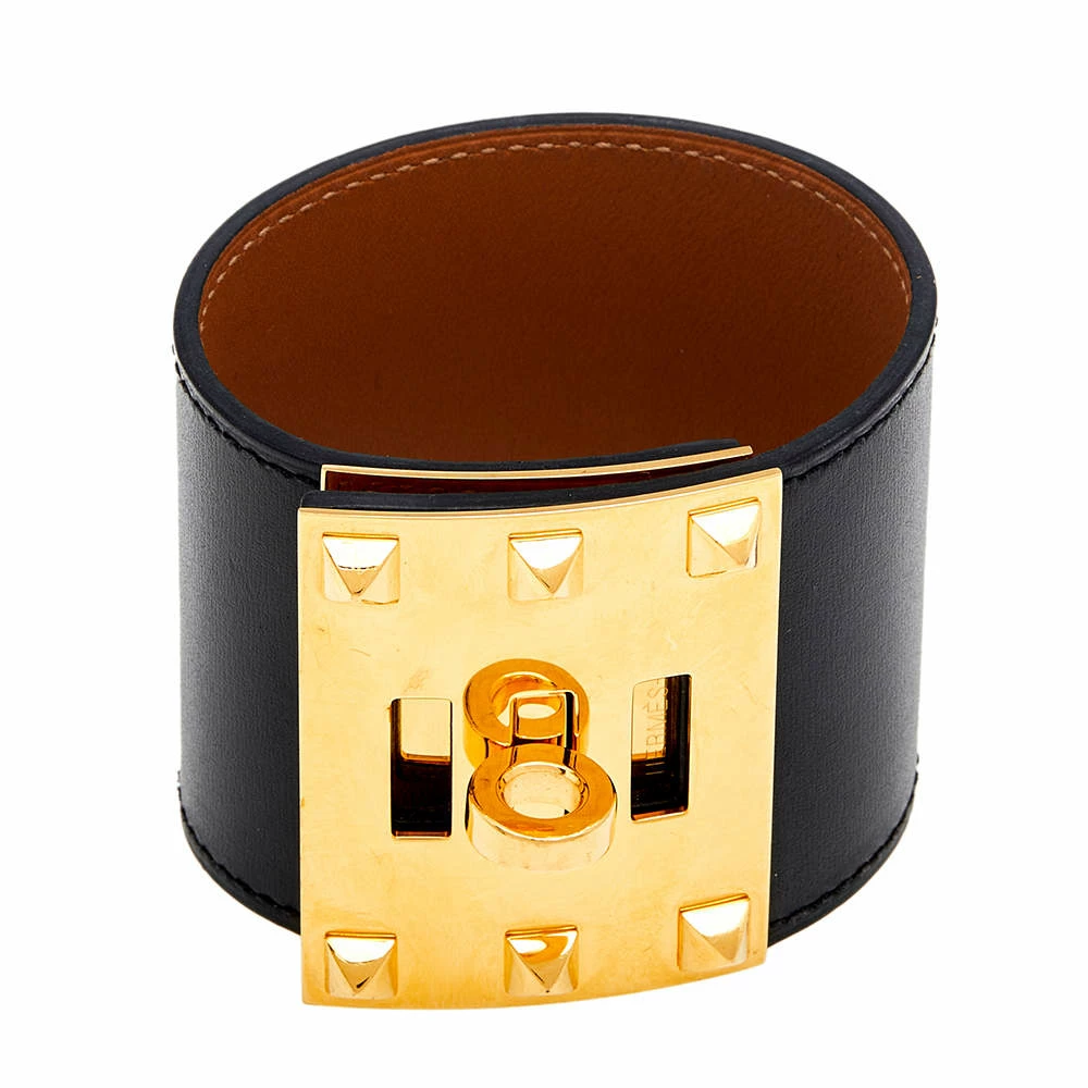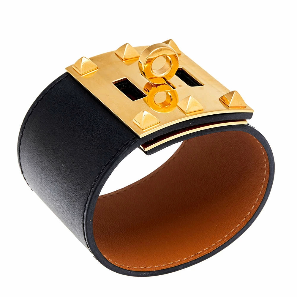 Attain a fashion-forward look with this unique Hermes Kelly Dog bracelet. Featuring a wide black band with gold plated Kelly closure, it is also accented with dog collar details. Smartly crafted from leather, this piece will elevate your style quotient.