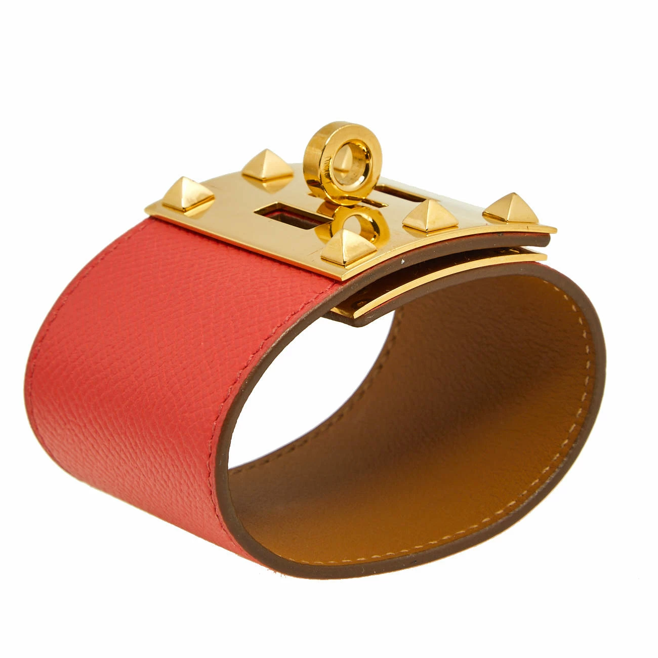 A famous design by Hermès, this Kelly Dog bracelet in Epsom leather is a prize to delight the style of luxurious women. This bracelet features gold-plated hardware and the Kelly twist lock is accompanied by pyramid studs.
