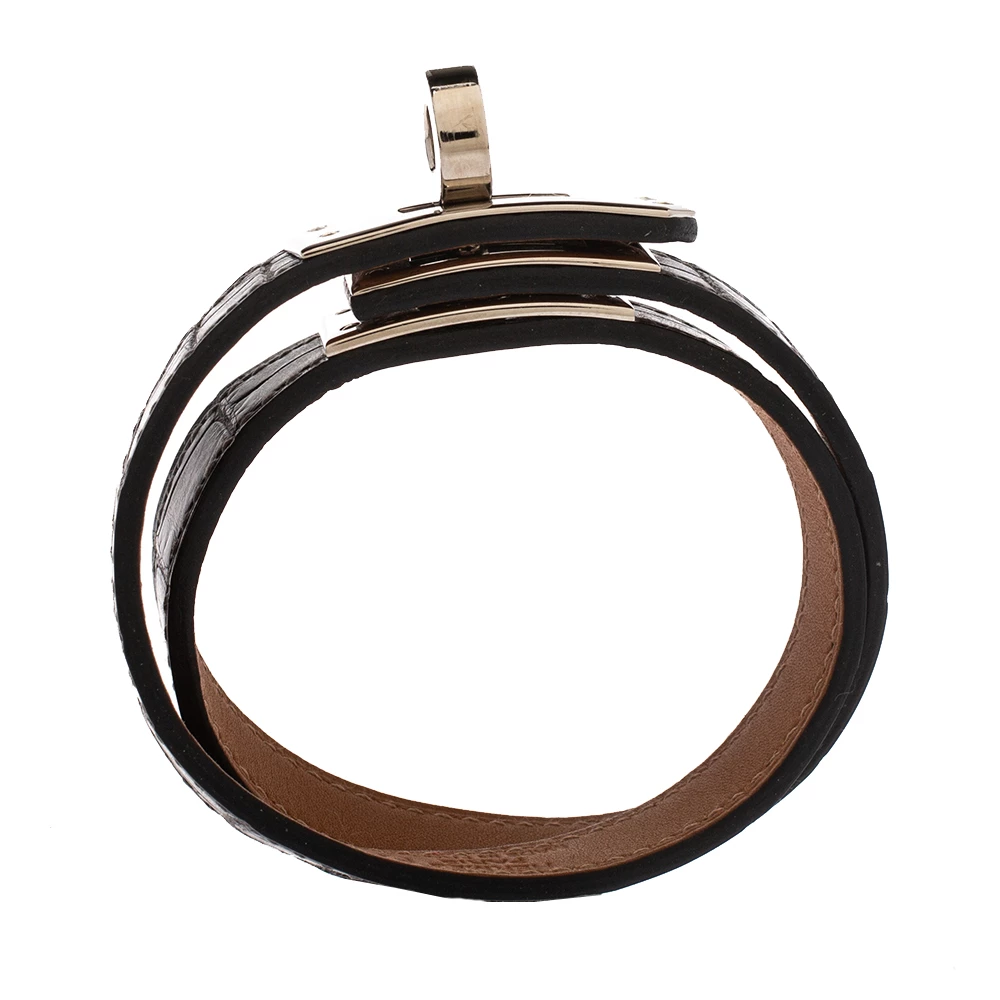 Understated yet classy, this Hermes Kelly Double Tour bracelet is a common favourite amongst fashional accessory lovers. Designed with alligator leather, this bracelet is centred with palladium-plated hardware detail featuring the label’s iconic Kelly turn-around closure. This accessory will perfectly go well with just about anything.