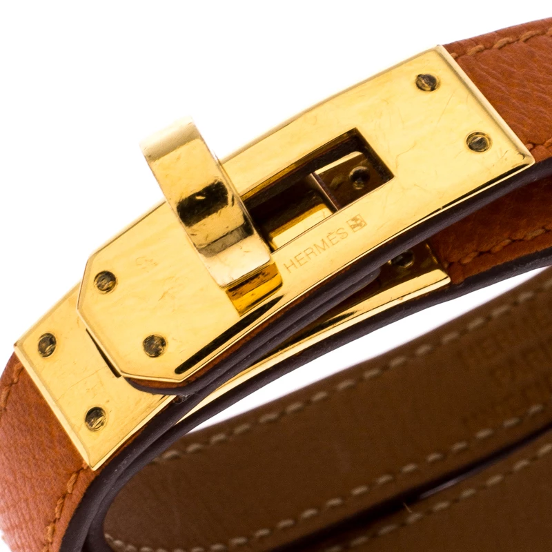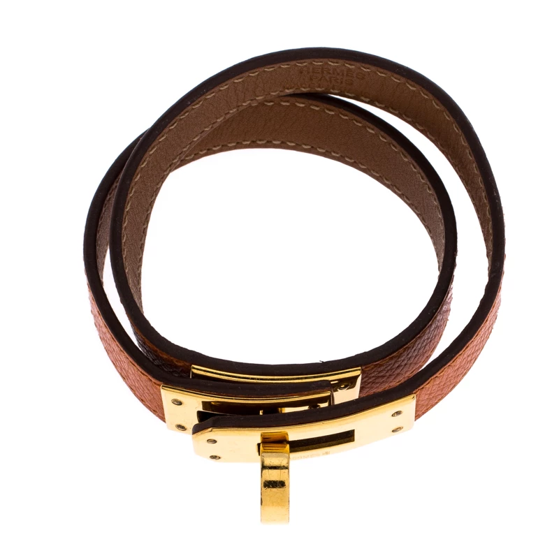 This Hermes Double Tour wrap bracelet is a chic accessory that can be paired with everything, from causals to evening outfits. Made from leather in a lovely orange shade, it is beautified with a Kelly twist closure in gold-plated metal. The bracelet has a long strap that wraps twice around your wrist.