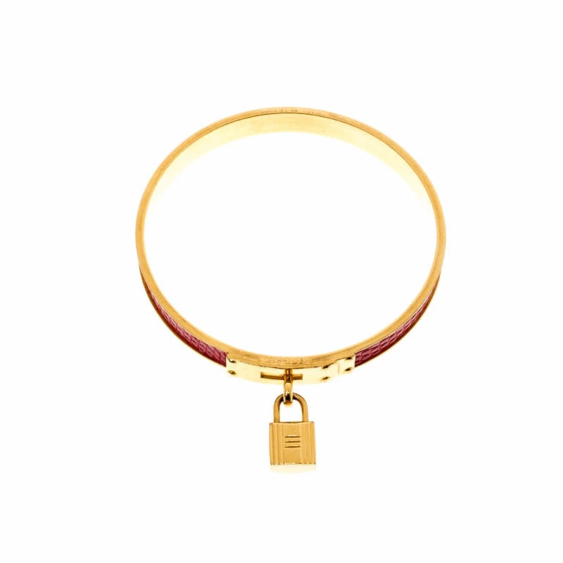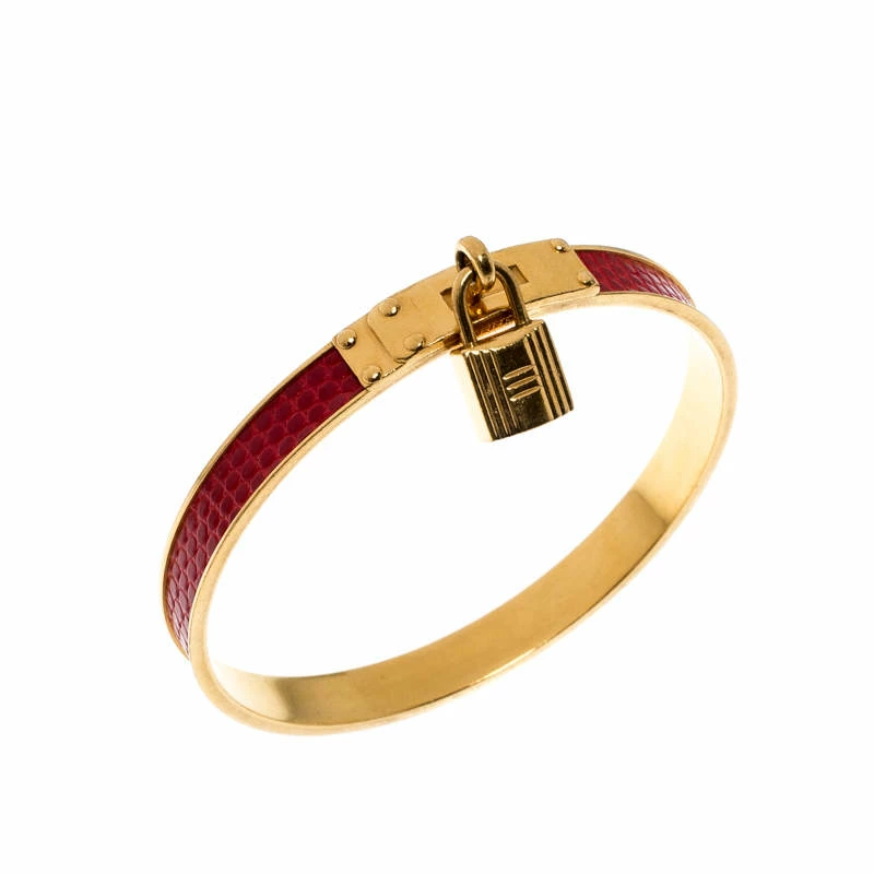 The Kelly is a name synonymous with Hermes. It is a symbol of their wondrous dedication to craftsmanship and classic style. First designed by Robert Dumas, the Kelly bag is known and coveted around the world. The lock of the bag, which is a turn lock, now appears in bracelets and jewellery. This bangle bracelet also carries the iconic Kelly lock and it comes crafted using gold-plated metal. The bracelet is then set with red lizard skin. This wondrous creation deserves to be yours.