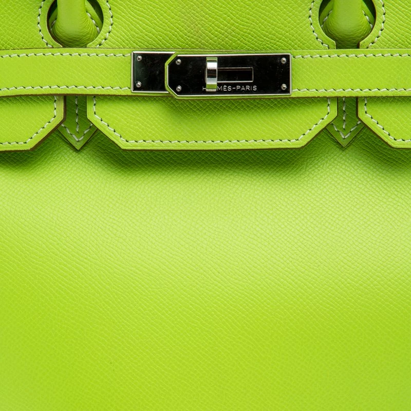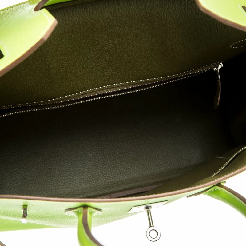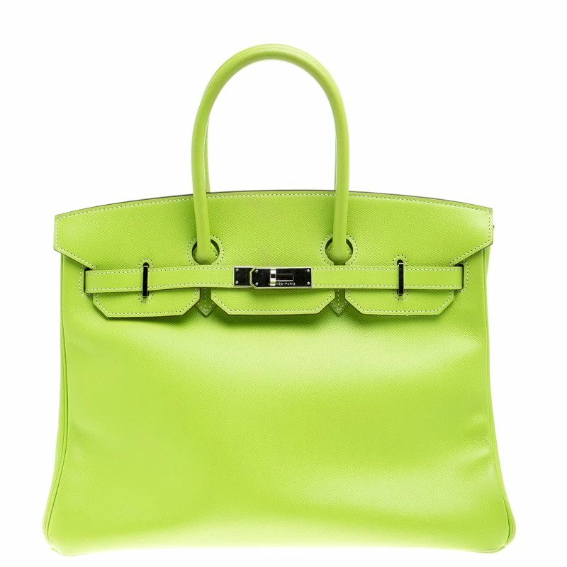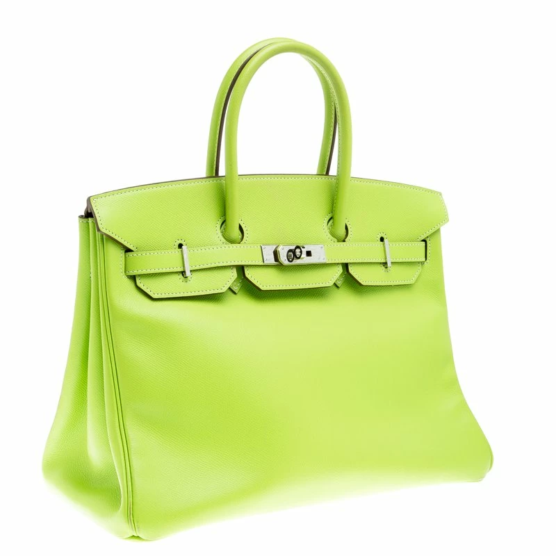 Hermes Birkin was inspired by Jane Birkin and is one of the most desired handbags in the world. A timeless classic that never goes out of style. Handcrafted from the highest quality of leather by skilled artisans, it takes over 18 hours of rigorous effort to stitch a Birkin together. Crafted in France from Epsom leather, the bag features dual top rolled leather handles and Kiwi color that sets it apart. The bag comes with palladium hardware and has a spacious leather lined interior that houses a slip and zip pocket. Birkin 35 can hold all your daily necessities and more. High quality and flawless craftsmanship are synonymous with Hermes. Invest in this collectible as it retains its value year after year.