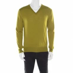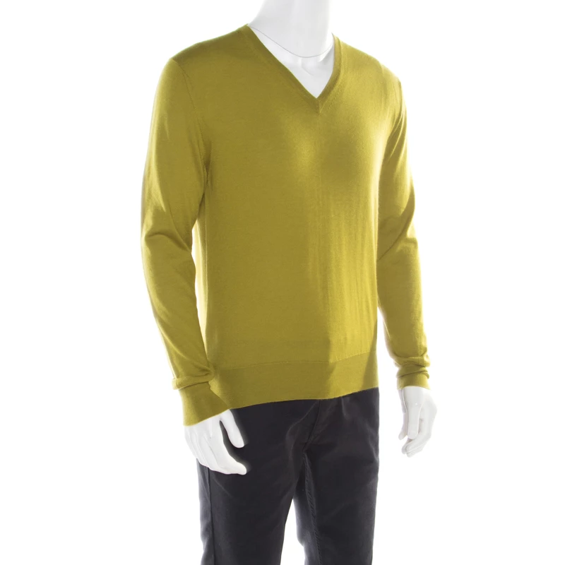 Plush and warm, this sweater by Hermes is made from a blend of silk and cashmere. It is styled with long sleeves and a V-neckline. Fine knitting and a lime green hue complete this sweater with a subtle charm. Nail a super style look by pairing this sweater with a pair of jeans and boots.