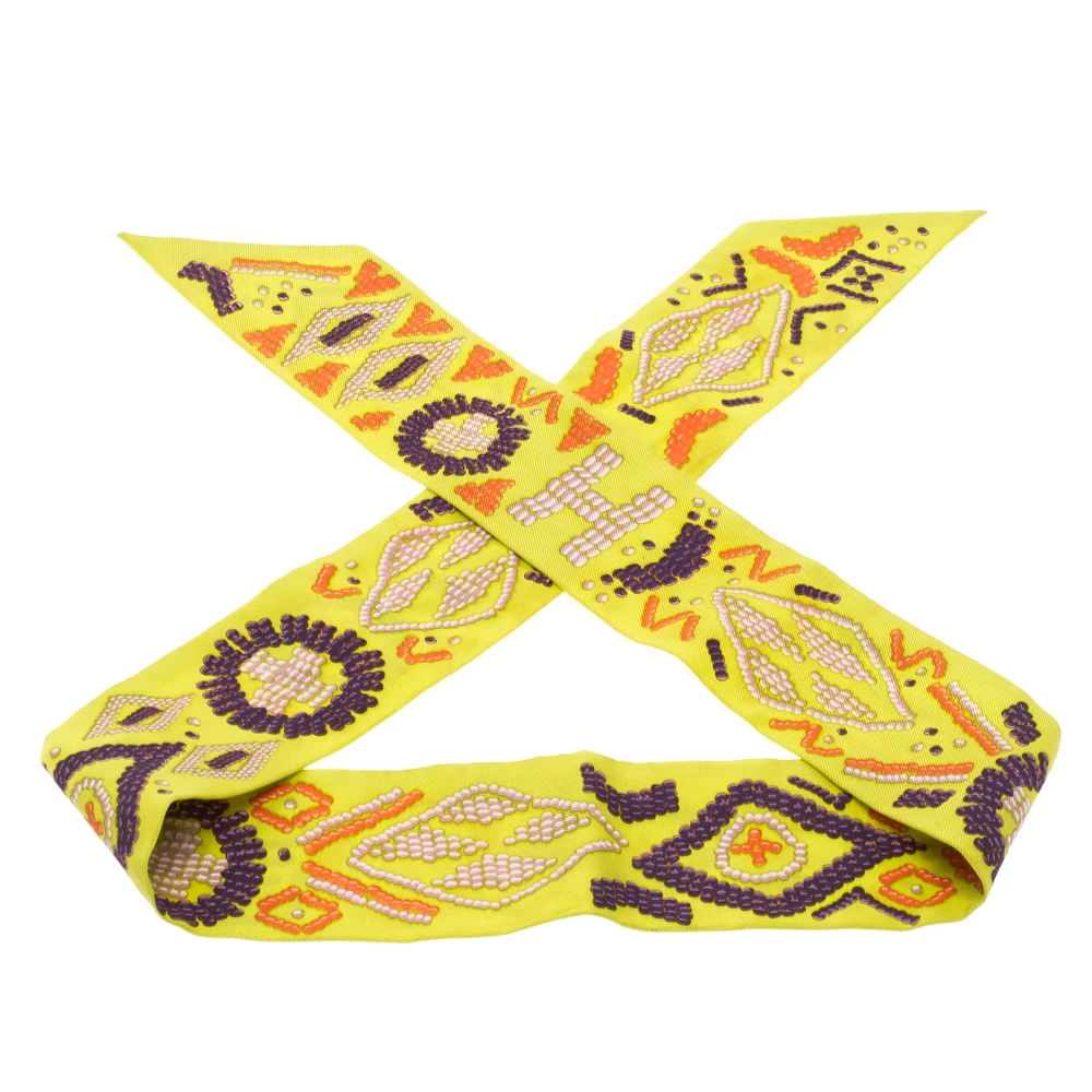 A beautiful Twilly scarf from the house of Hermes can be that perfect summer accessory to add a subtle hint of style and luxury to your look. Crafted in lime green silk, this Kelly en Perles scarf features multicoloured prints all through the scarf that stands out and adds a pop of colour to any look.