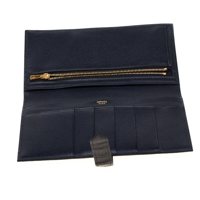 Luxuriously crafted by the experts at Hermes, this stunning Bearn Gusset wallet is a must have accessory for the luxury fashion lovers. Crafted in blue exotic alligator skin, this wallet carries an elegant appeal and a sleek silhouette. It features a gold-tone H on the front strap button closure that opens to matching leather-lined interior to complete the look. The interior is composed of multiple card slots, one slip and one zip pocket where you can conveniently store your cards, cash and bills. This wallet is a charmer that can be carried solo in the hand and can be stowed easily in one of the brand’s luxury bags.