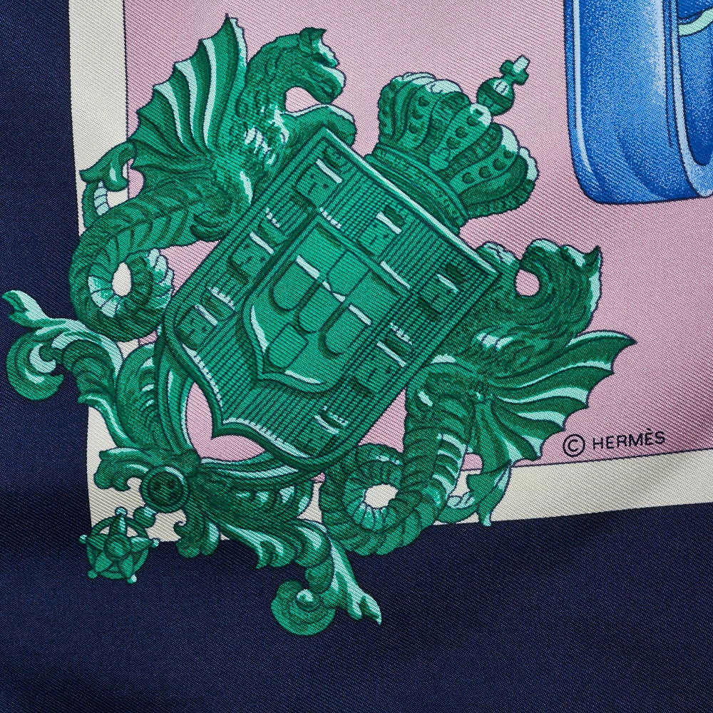 This beautiful scarf from Hermes reimagines the iconic Harnais de Cour design of Philippe Ledoux. The subtle use of colors and a busy yet refined design make this silk scarf an accessory worth-possessing. You wear it in multiple ways, around your neck, or as a headscarf.