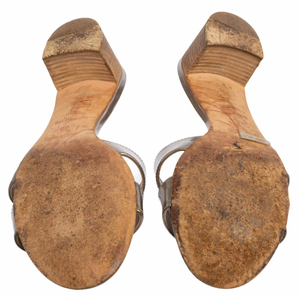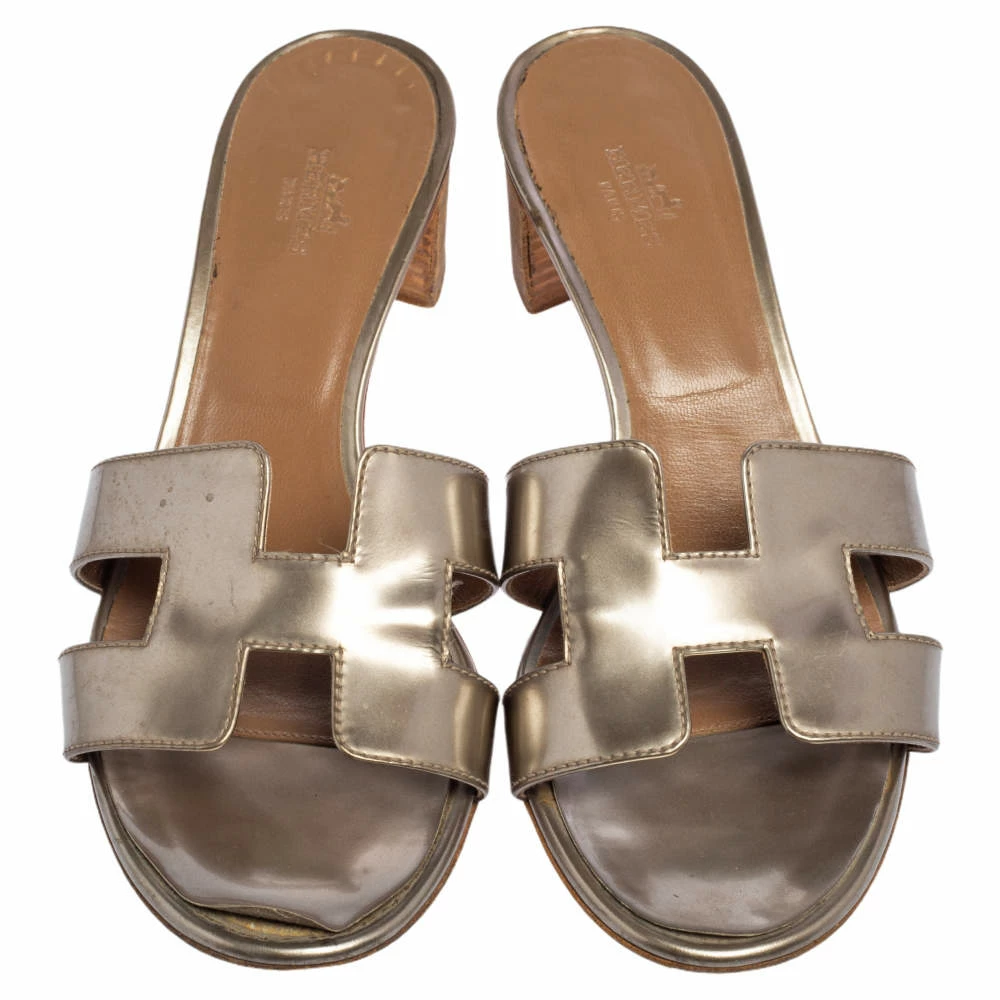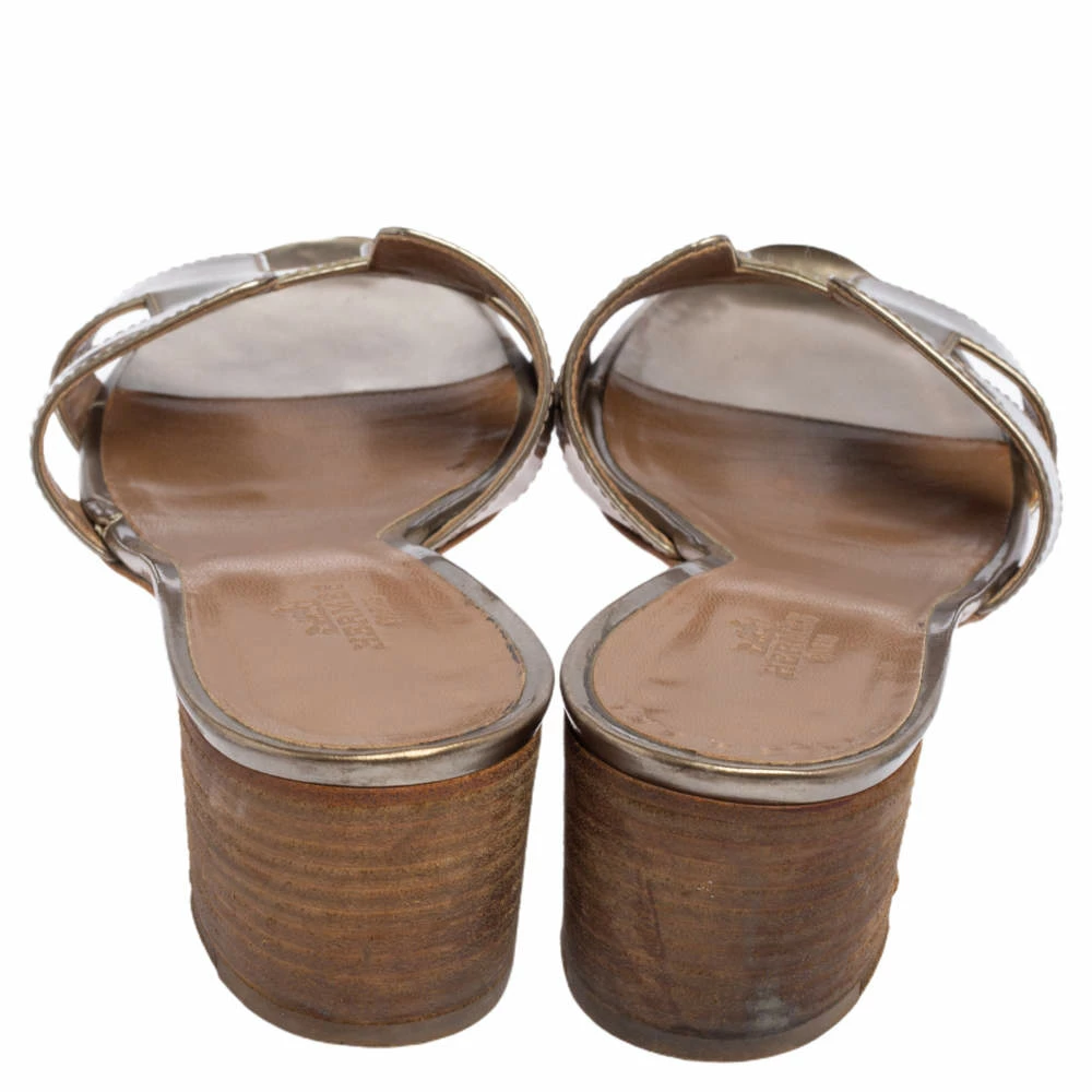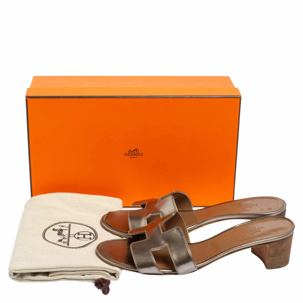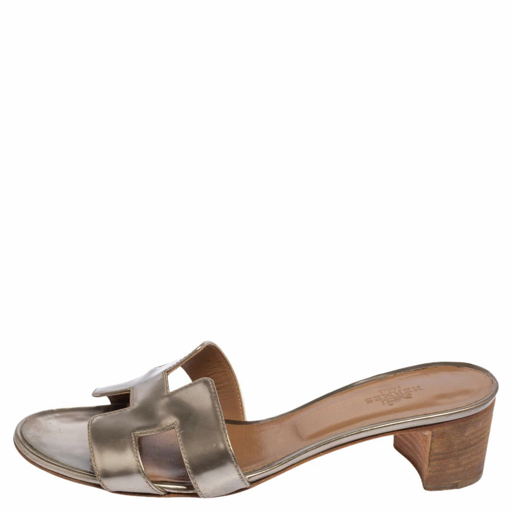 Put your best foot forward this season in these pretty Hermès sandals. These Oasis sandals have been crafted from high-quality patent leather in Italy and feature the iconic H on the vamps and block heels. The comfortable insoles are meant to provide comfort at every step. These metallic beige sandals are sure to attract admirers and will complement most of your attires.
