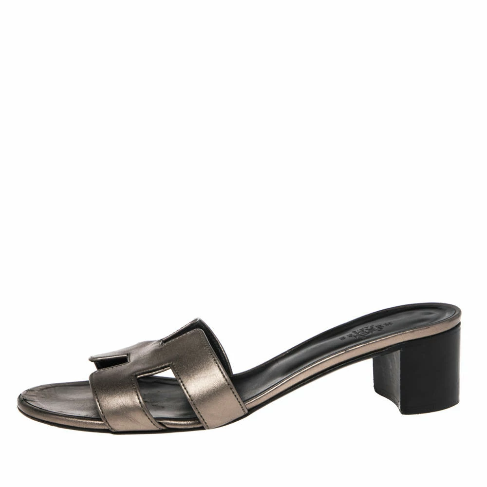 Crafted in leather, these Oasis slide sandals from Hermes are classy and comfortable with their block heels. These slides feature the signature H-shaped straps at the front. The insoles are lined with leather and carry the brand label.