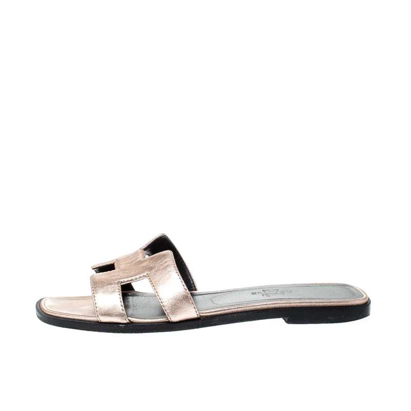 Put your best foot forward this season in these pretty Hermes sandals. These metallic bronze Oran sandals have been crafted from leather in Italy and they feature the iconic H on the vamps as well as insoles meant to provide comfort at every step. These sandals are sure to attract admirers!