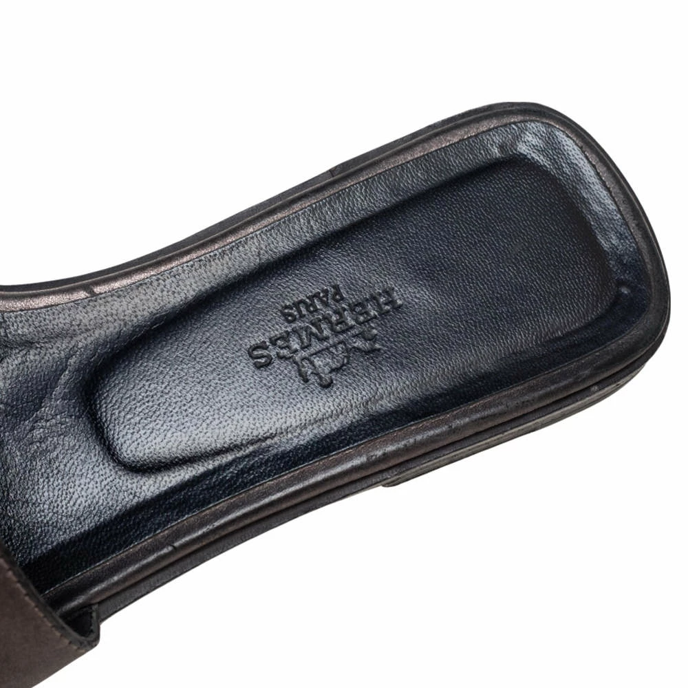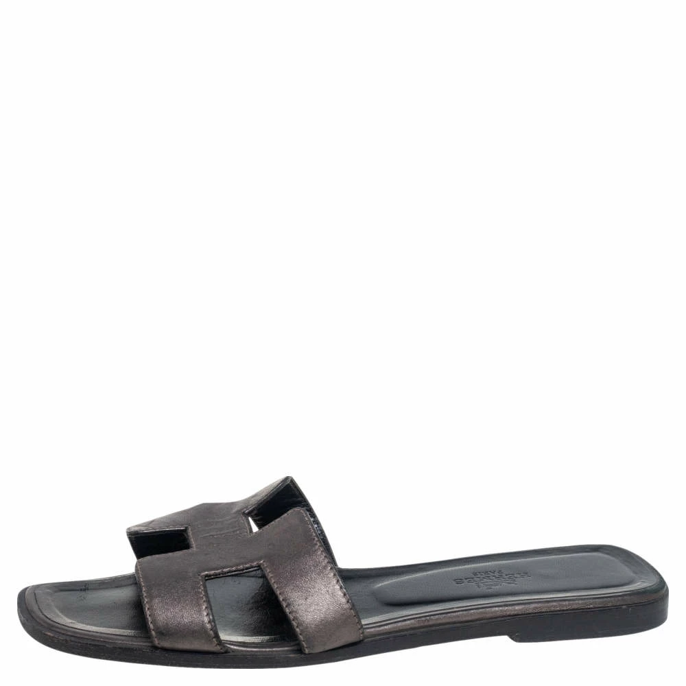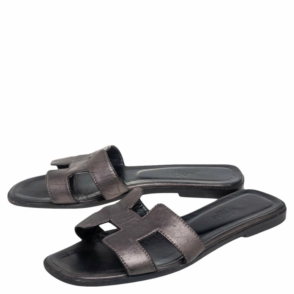 Put your best foot forward this season in these pretty Hermes sandals. These metallic grey Oran sandals have been crafted from leather in Italy and they feature the iconic H on the vamps as well as insoles meant to provide comfort at every step. These sandals are sure to attract admirers!