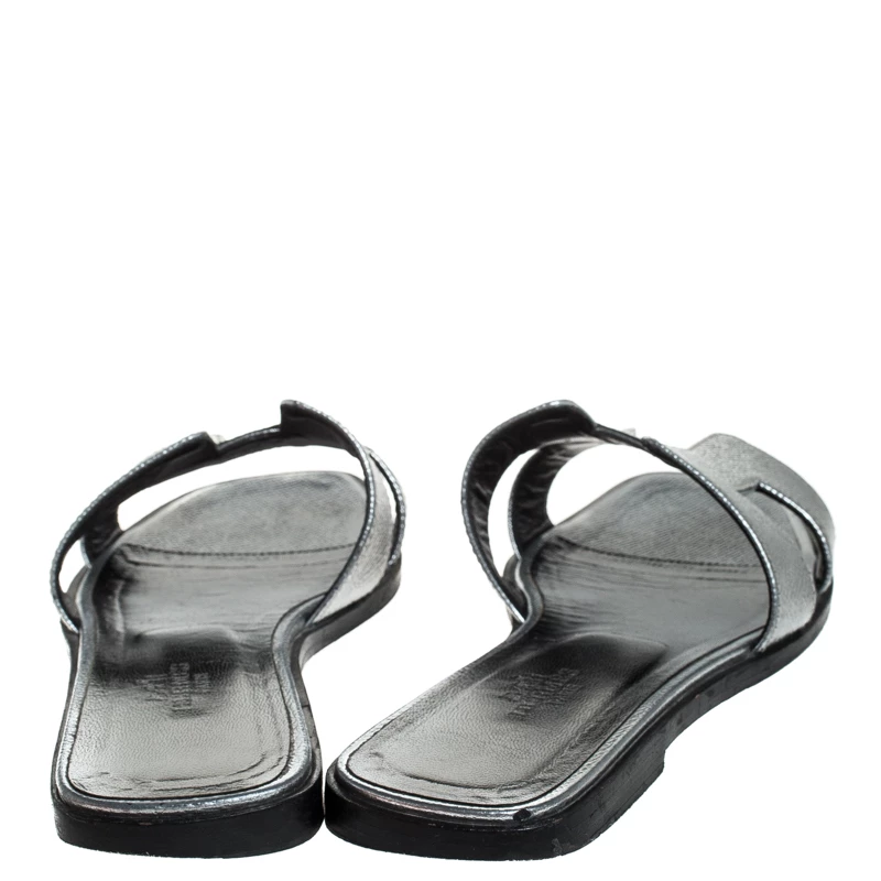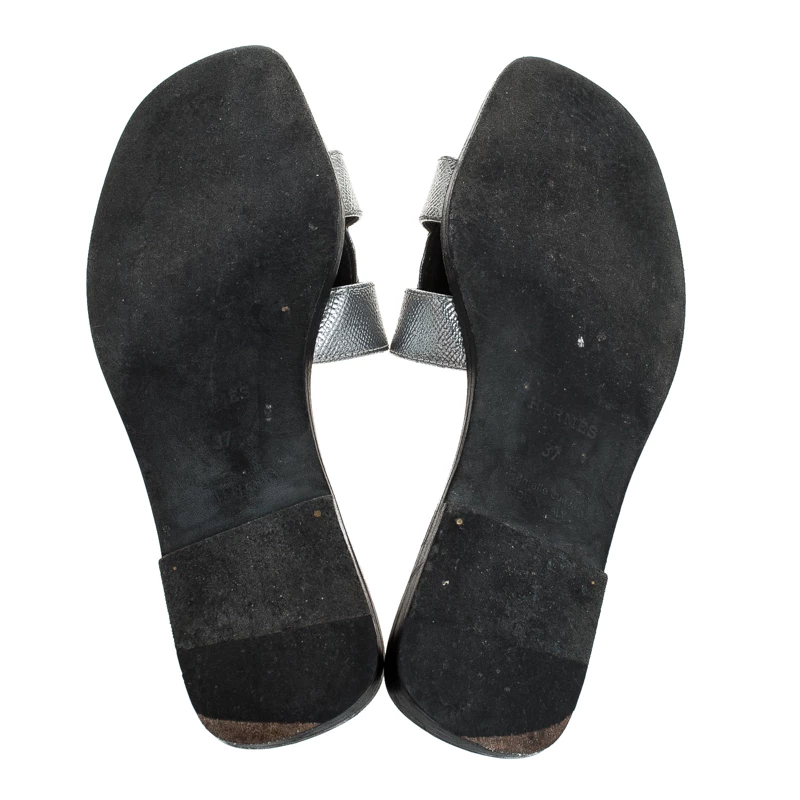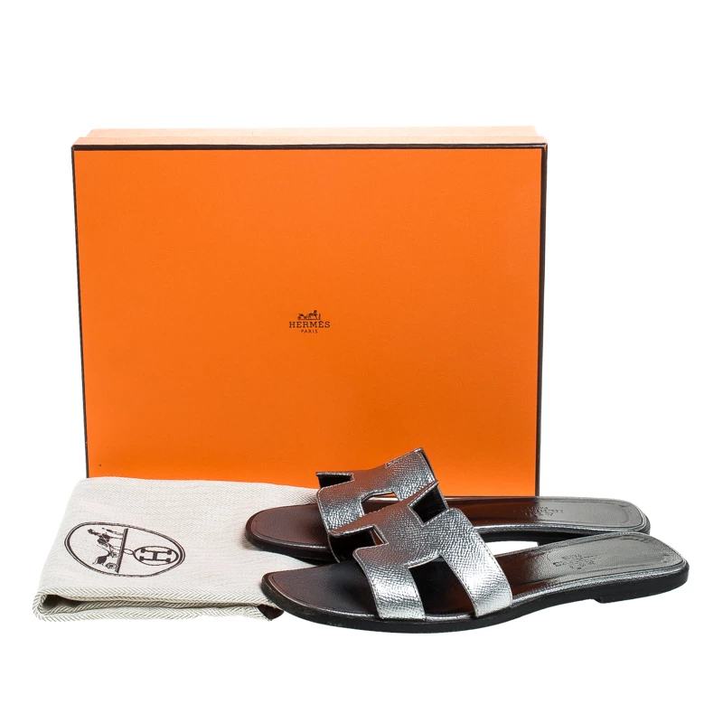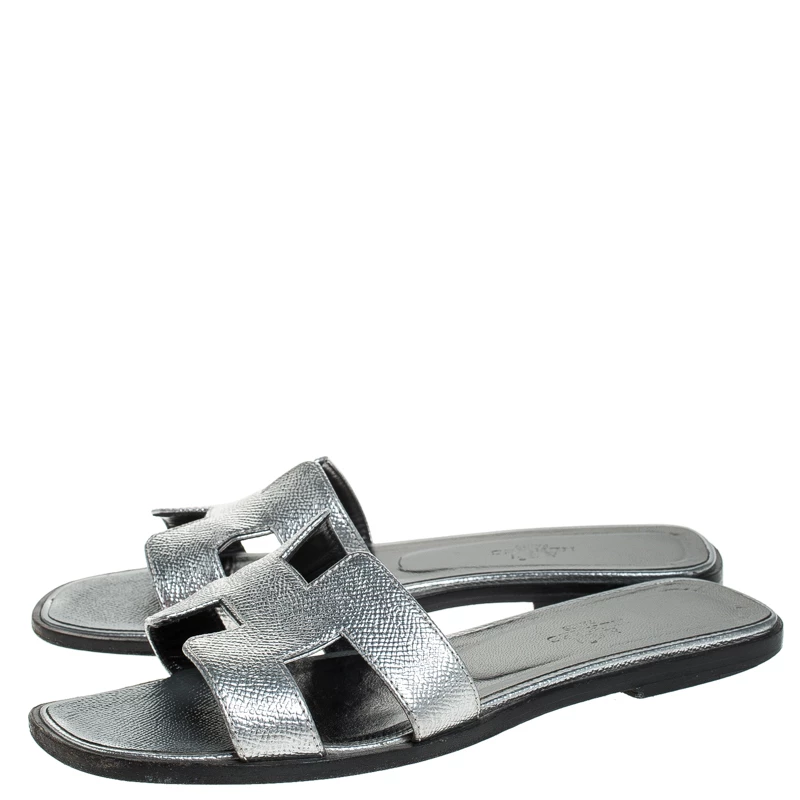 Put your best foot forward this season in these pretty Hermes sandals. These metallic Oran sandals have been crafted from textured leather in Italy and they feature the iconic H on the vamps as well as insoles meant to provide comfort at every step. These sandals are sure to attract admirers!