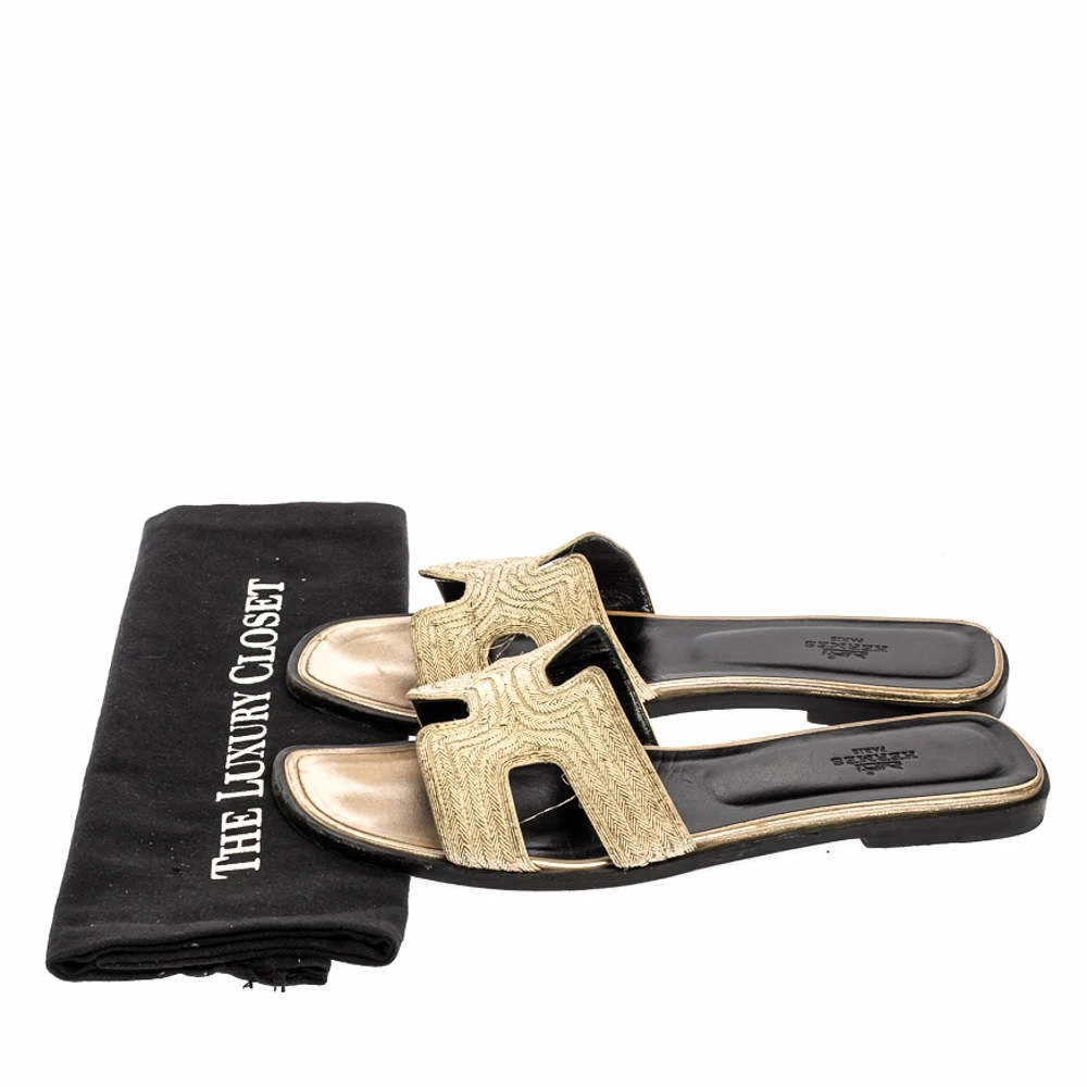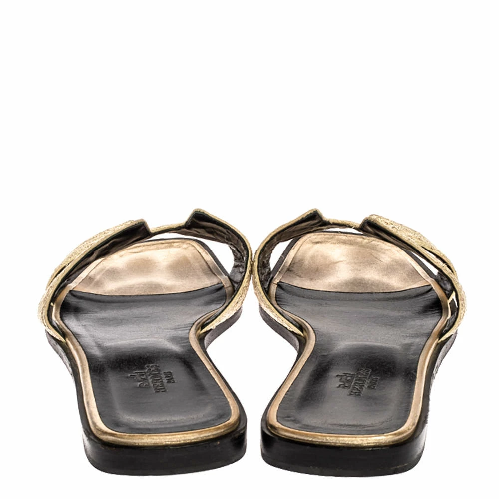 Put your best foot forward this season in these pretty Hermes sandals. These metallic Oran sandals have been crafted from twisted metal threads in Italy and they feature the iconic H on the vamps as well as insoles meant to provide comfort at every step. These sandals are sure to attract admirers!