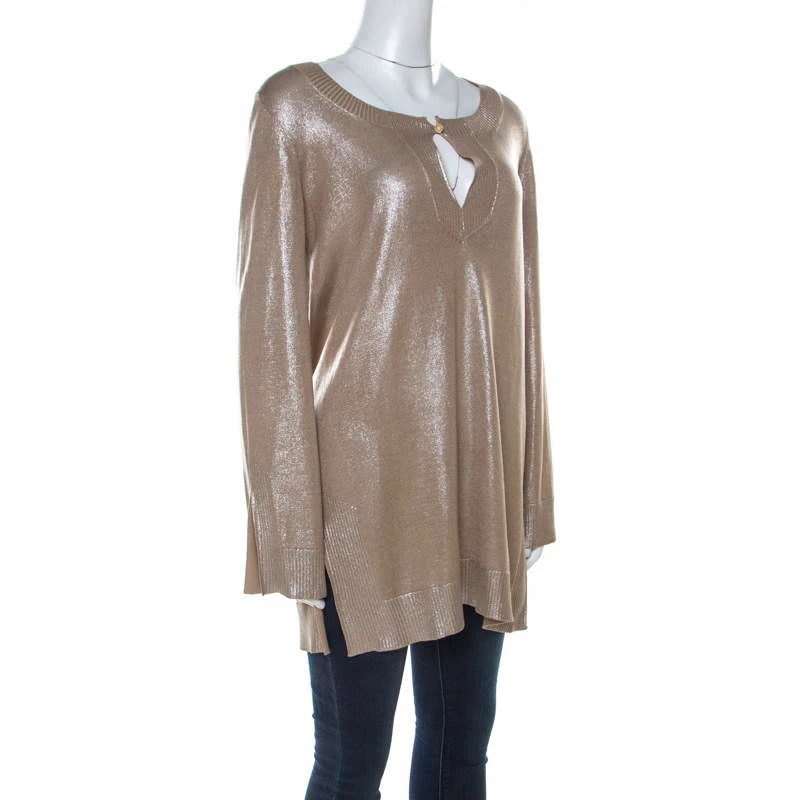 This piece is from Hermes and it truly is an example of the brand’s attention to quality and creativity. The sweater is made from silk and enhanced with lurex knit detailing. It features a cutout with button closure at the front and long sleeves.