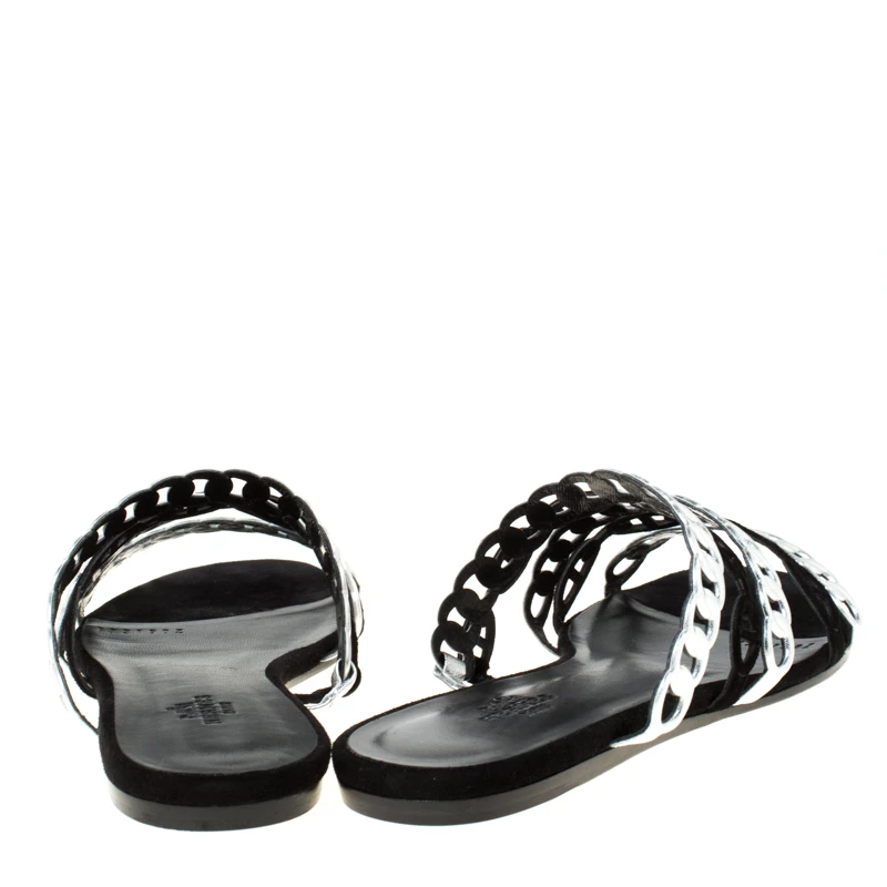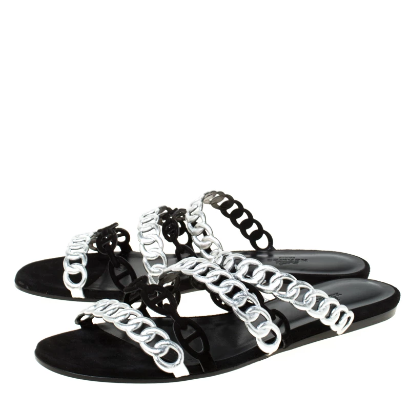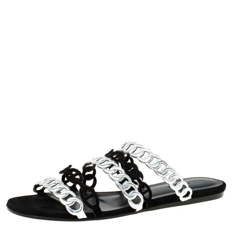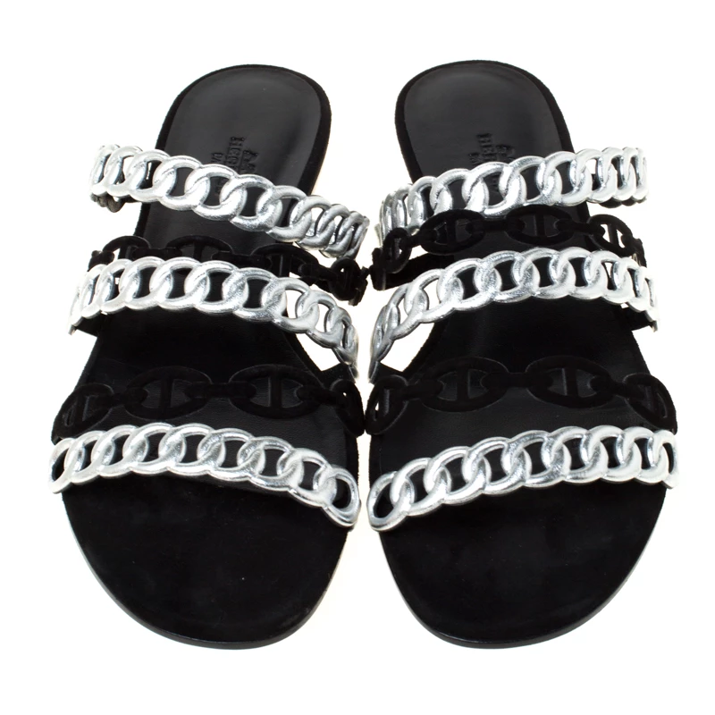 How stylish and chic do these D’ancre Chaine sandals from Hermes look! These flat sandals have an open toe silhouette featuring multiple straps across the vamps that resemble interlocking chains, rendered in metallic silver leather and black suede. Grab them today and experience comfort like never before.