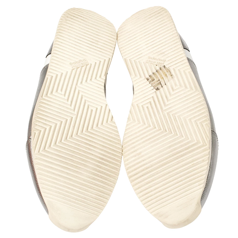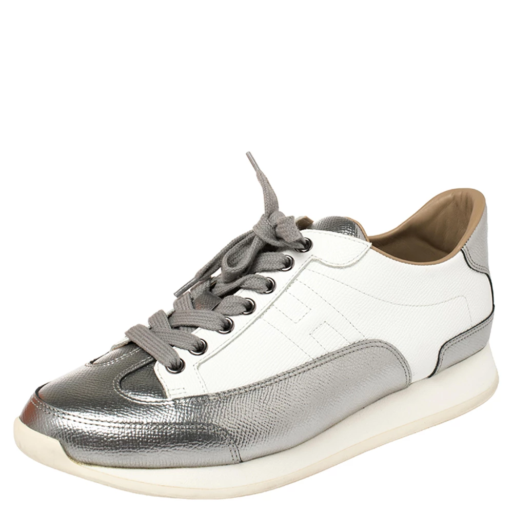 Let this pair of low-top Hermès sneakers elevate your style this season. Crafted from metallic silver and white leather, these sneakers feature round toes and lace-ups on the vamps. They come detailed with ‘H’ initials on the sides and made comfortable with leather-lined insoles and tough rubber soles.