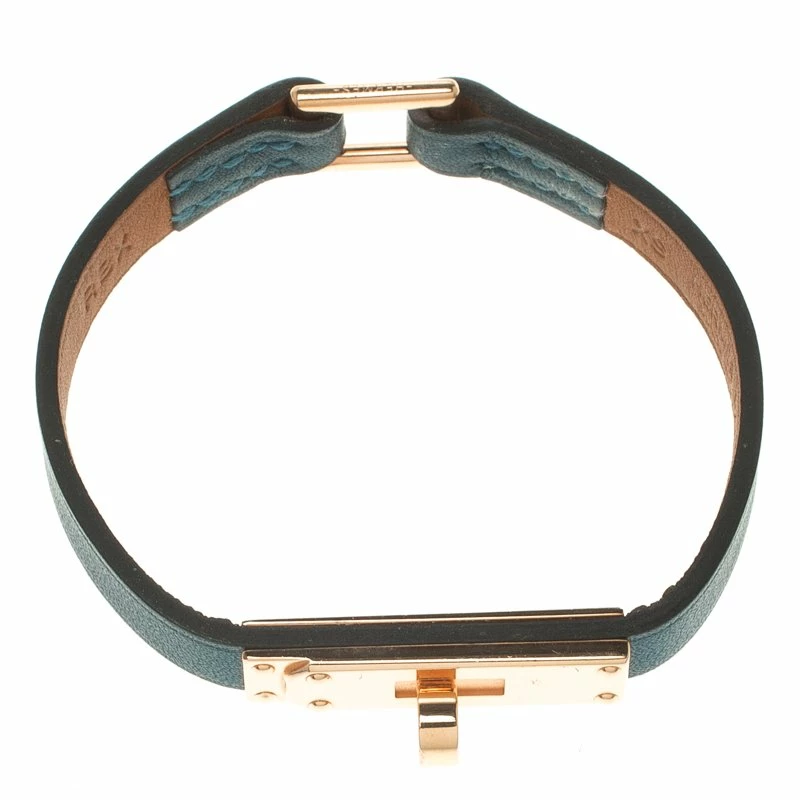 The 18K yellow gold plated Hermès’ Micro Kelly bracelet is made from blue leather. The rose gold plated closures work as the design element on the bracelet. The bracelet is sleek and has a narrow width. Wear this suave piece with your work wear attires.