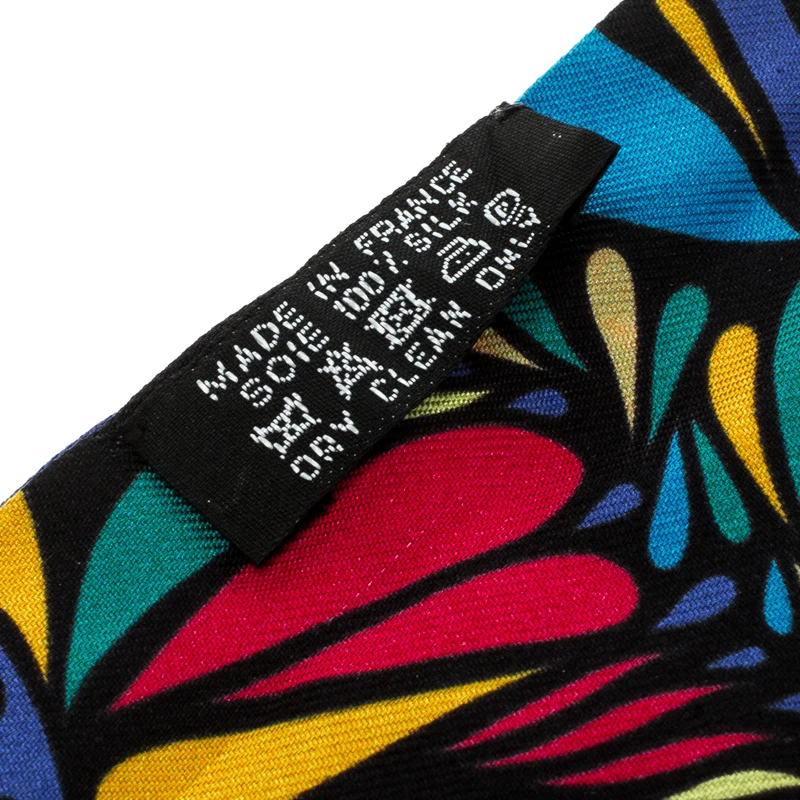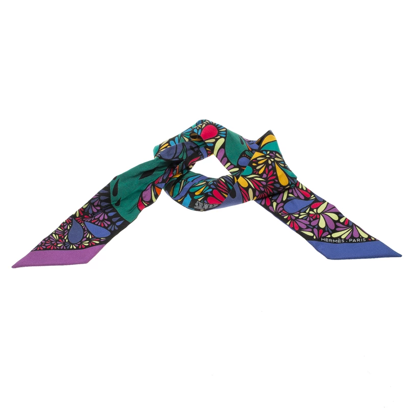 This vibrant Twilly scarf from Hermes is crafted in a luxurious silk with Millefleurs du Mexique Print on it. This sleek multicolor style comes with finished edges and can be styled in multiple ways. We like it neatly wrapped around the neck.