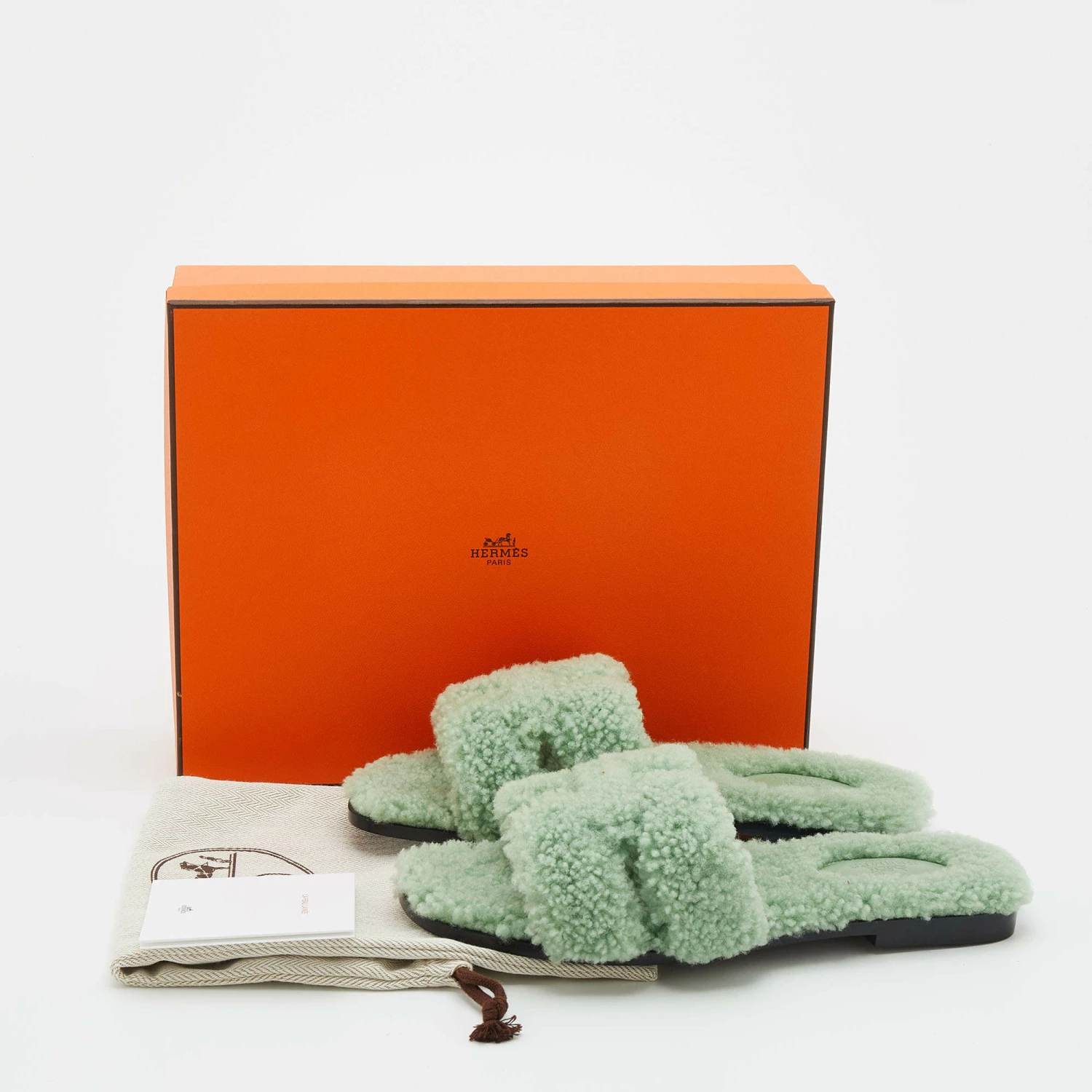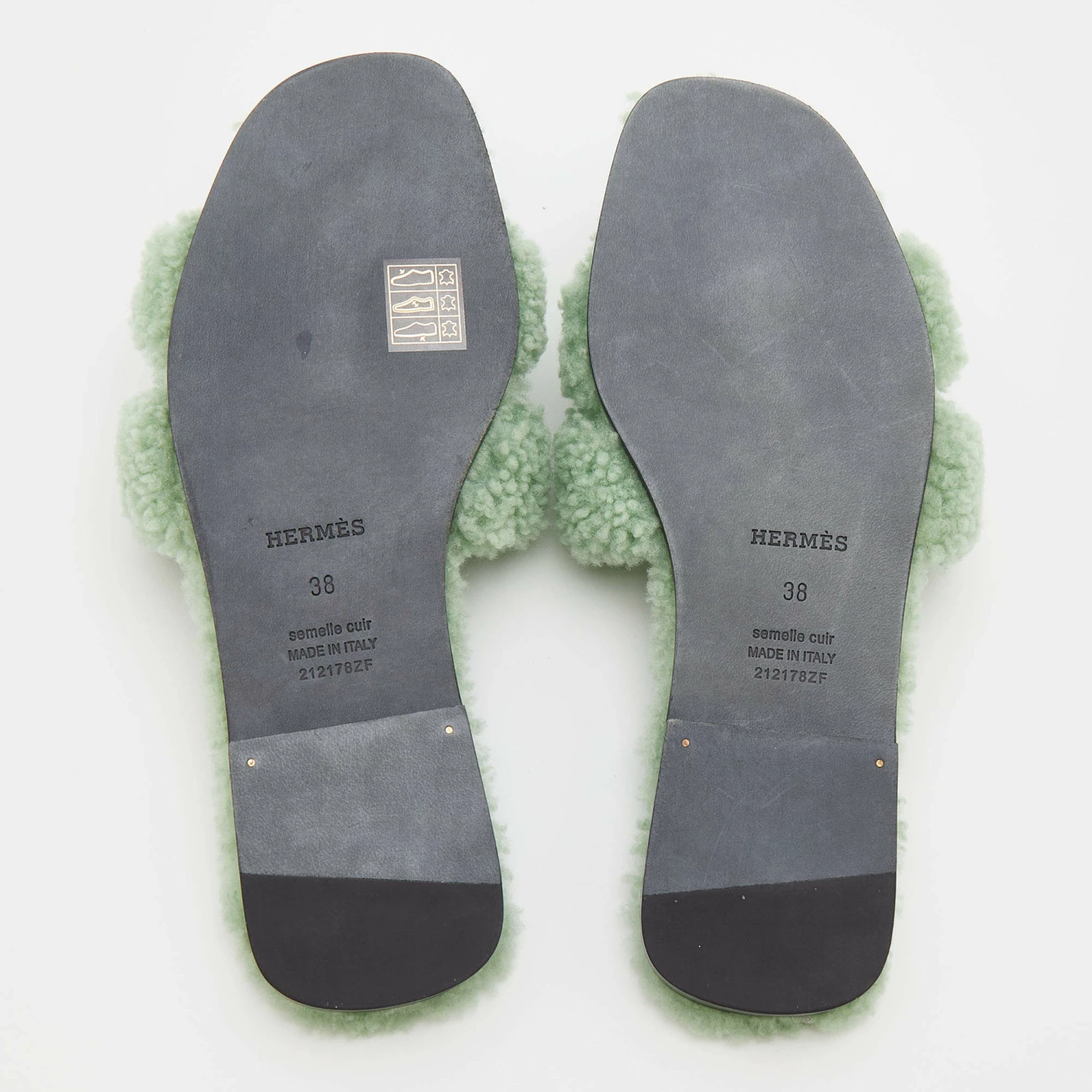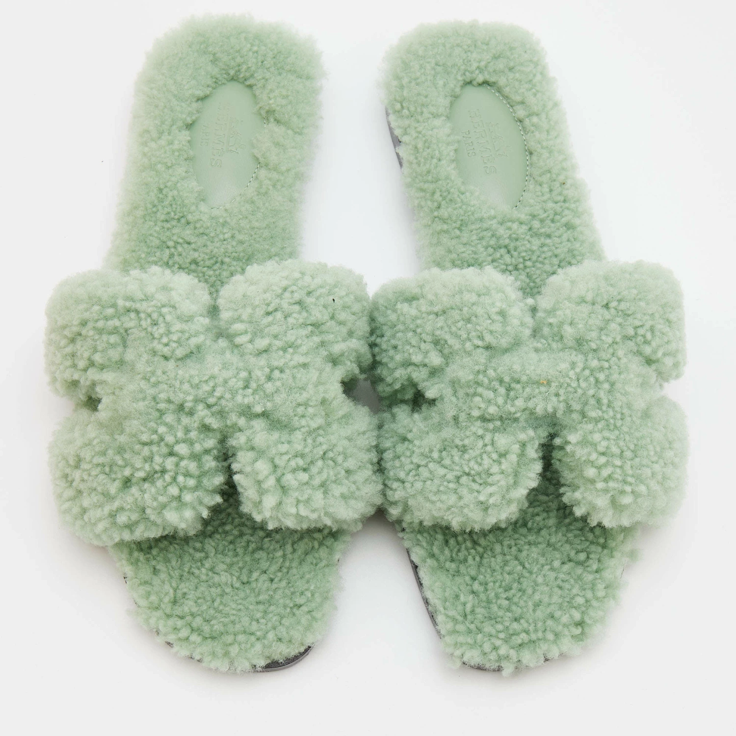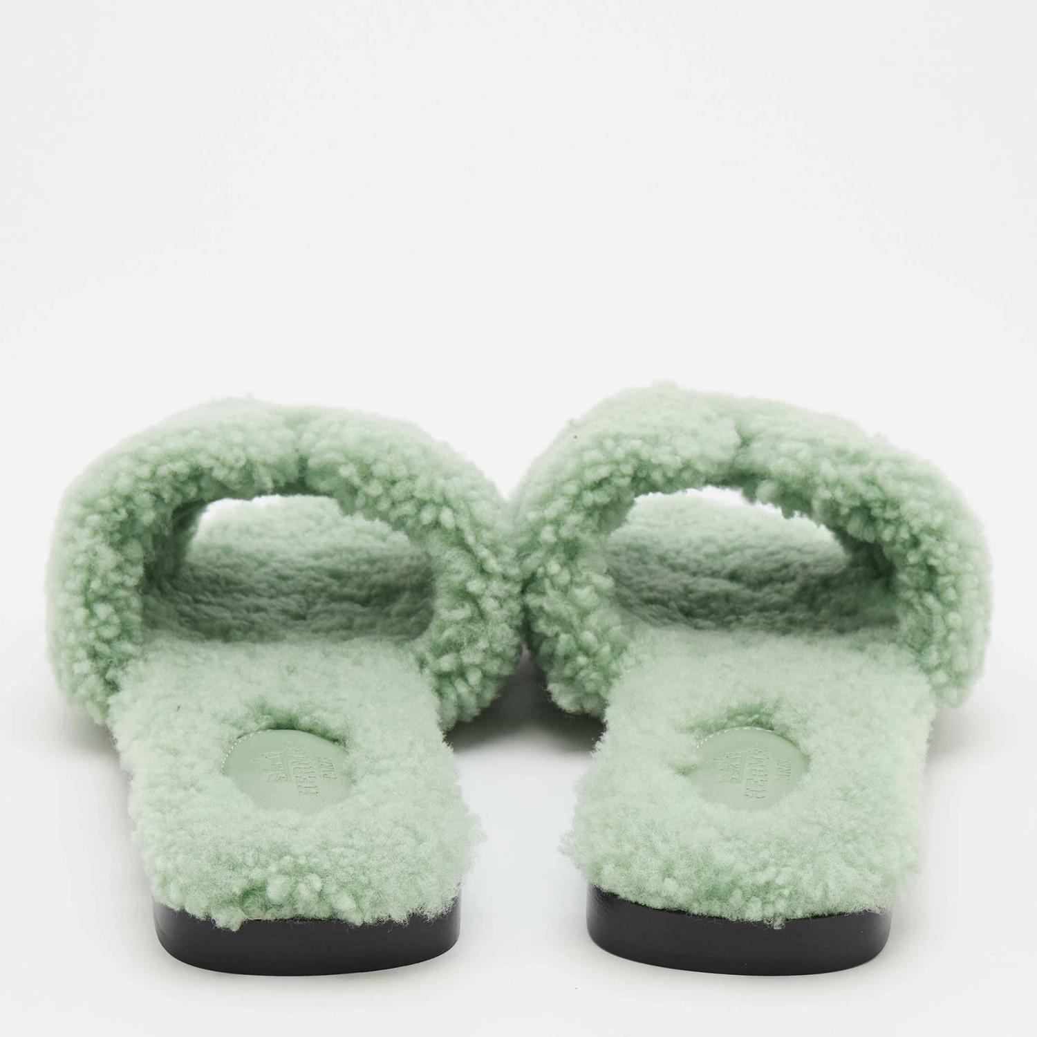 Lounge around in these Hermes Oran flats because it is like walking in the clouds in them, thanks to the super soft shearling fur exterior. The uppers come in the iconic H cut out and the flats have a subtle mint green shade.