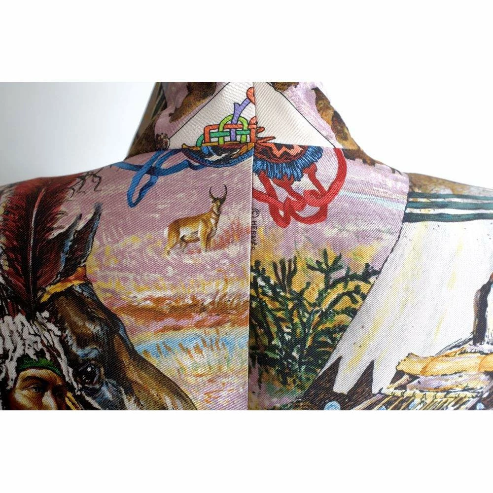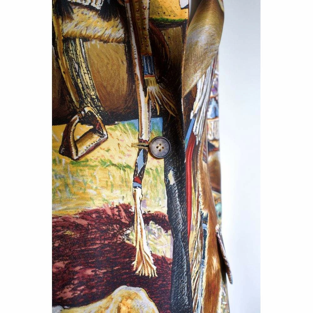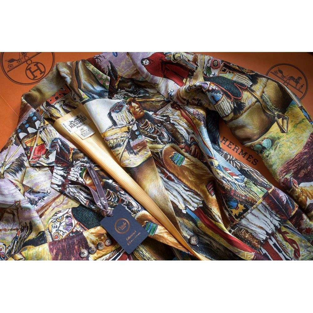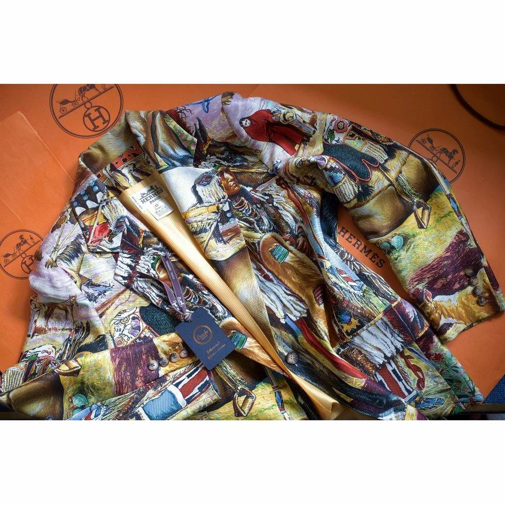 If your style is more modern and refined, this elegant Hermes blazer was designed with you in mind. Made from luxurious silk, this multicolor piece features the “The Feathers Of The West” motif by Master Oliver Kermit. Defined by two side pockets with flaps, Hermes Paris logoed bone buttons, and Hermes Paris logoed inner lining, this piece is perfect for an evening out.