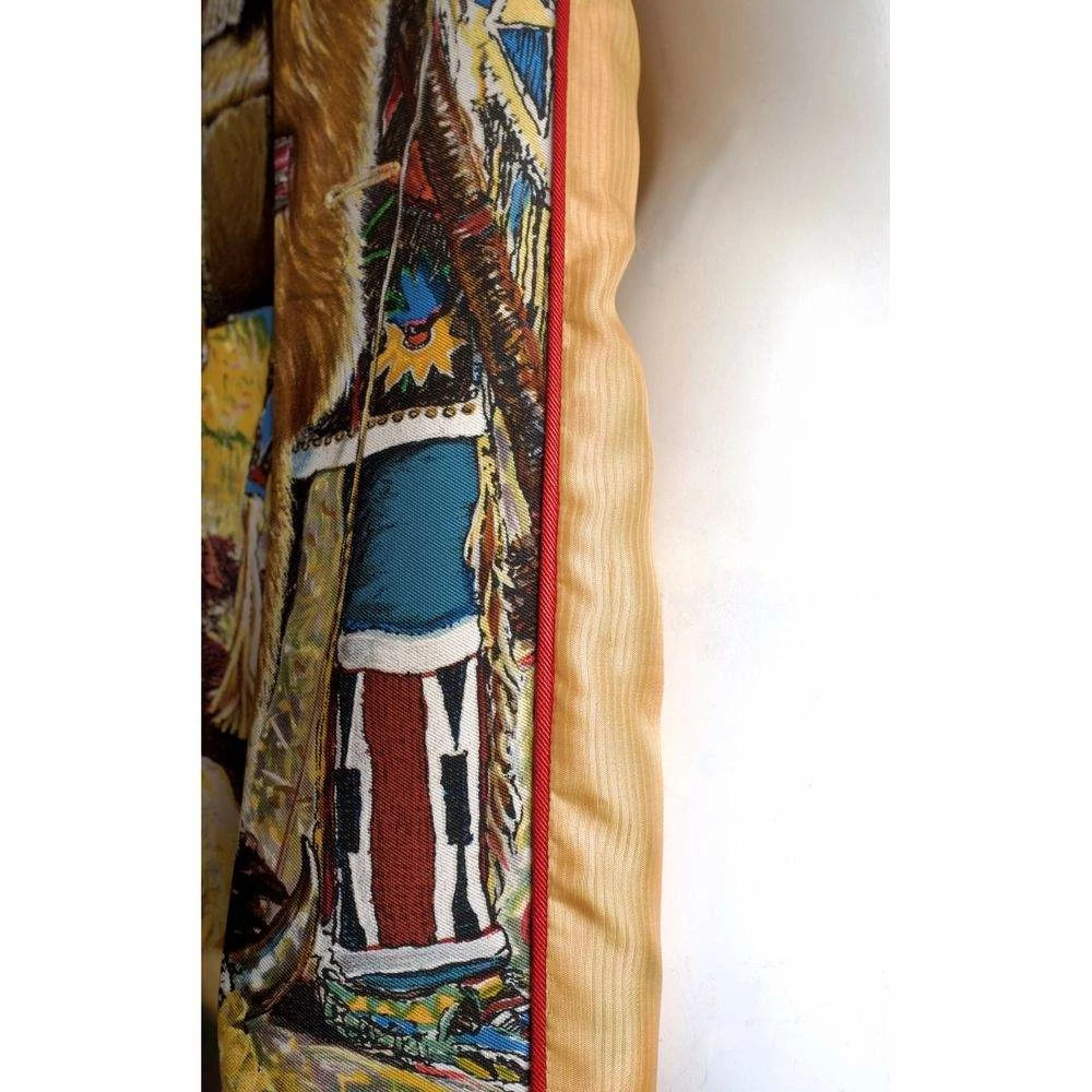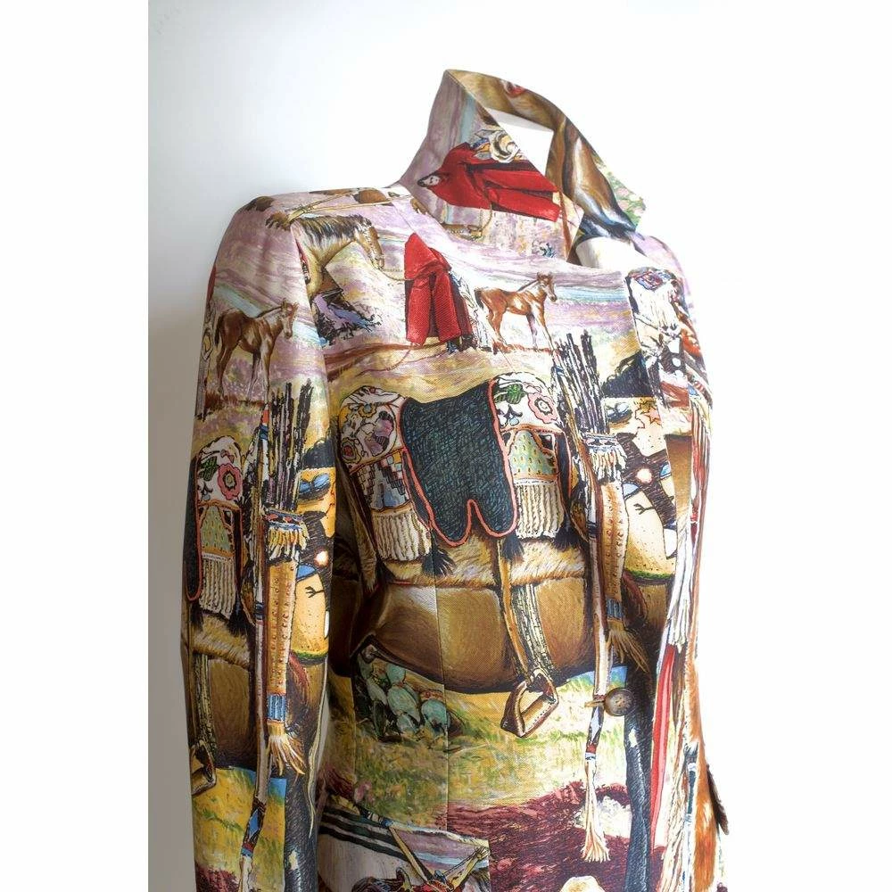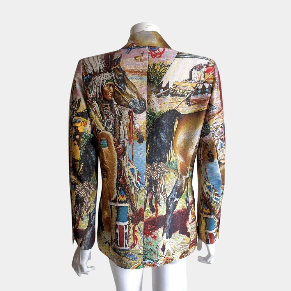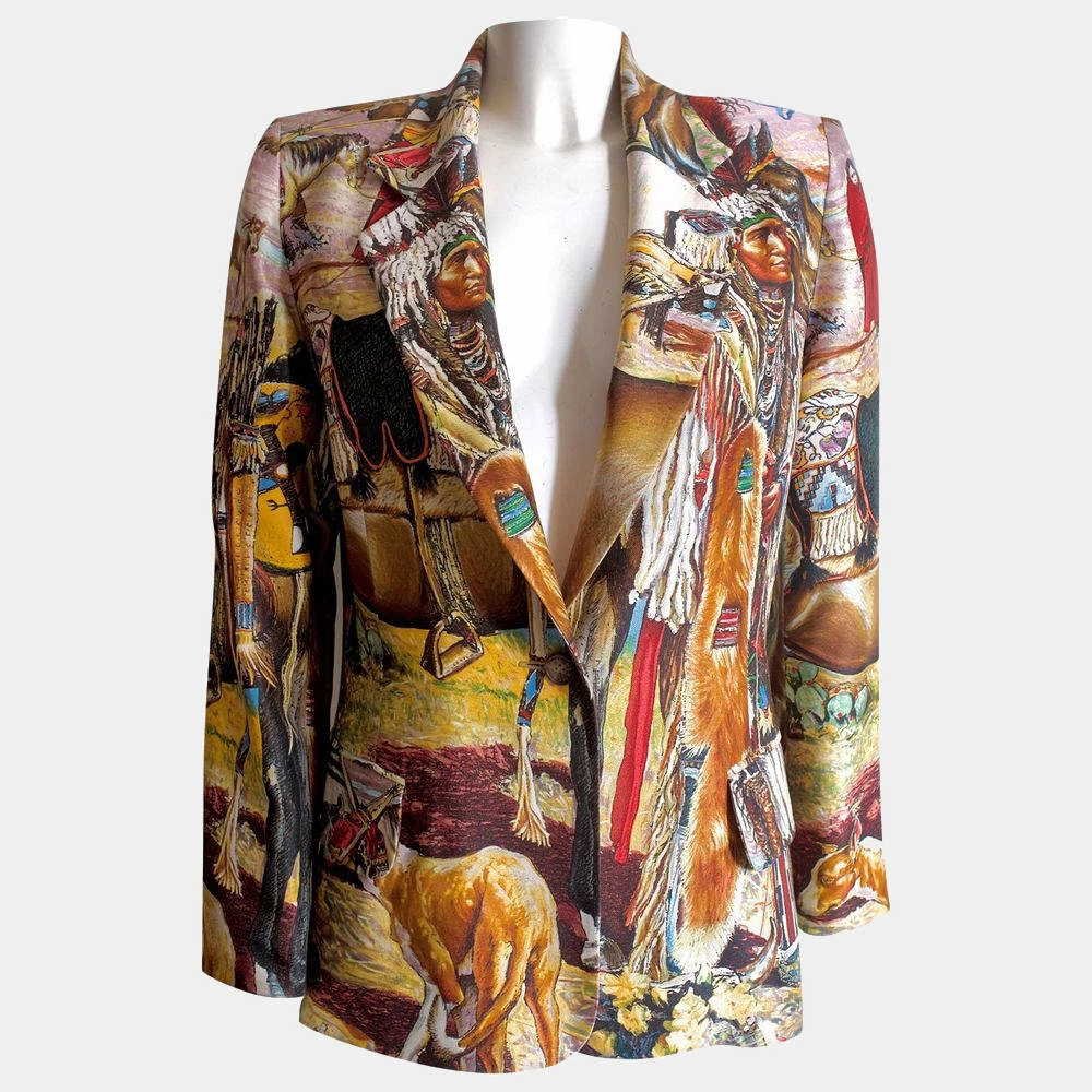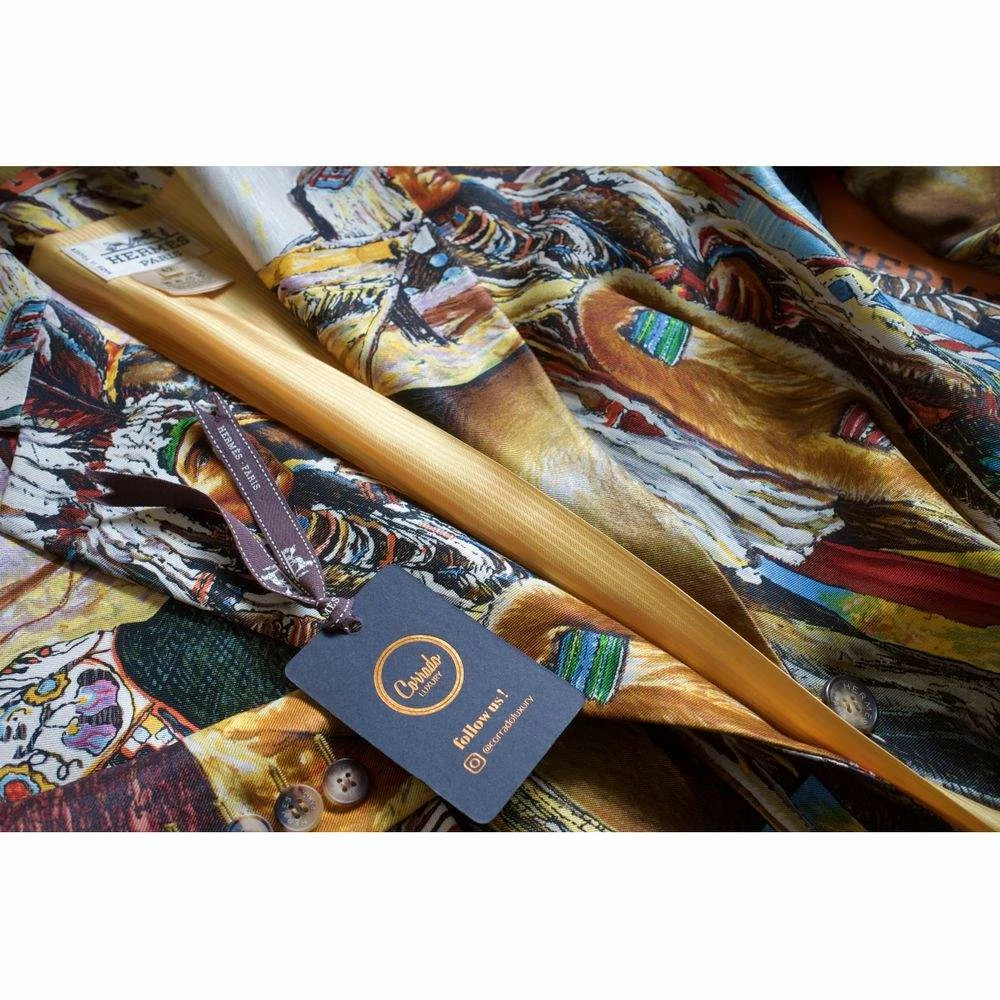 If your style is more modern and refined, this elegant Hermes blazer was designed with you in mind. Made from luxurious silk, this multicolor piece features the “The Feathers Of The West” motif by Master Oliver Kermit. Defined by two side pockets with flaps, Hermes Paris logoed bone buttons, and Hermes Paris logoed inner lining, this piece is perfect for an evening out.
