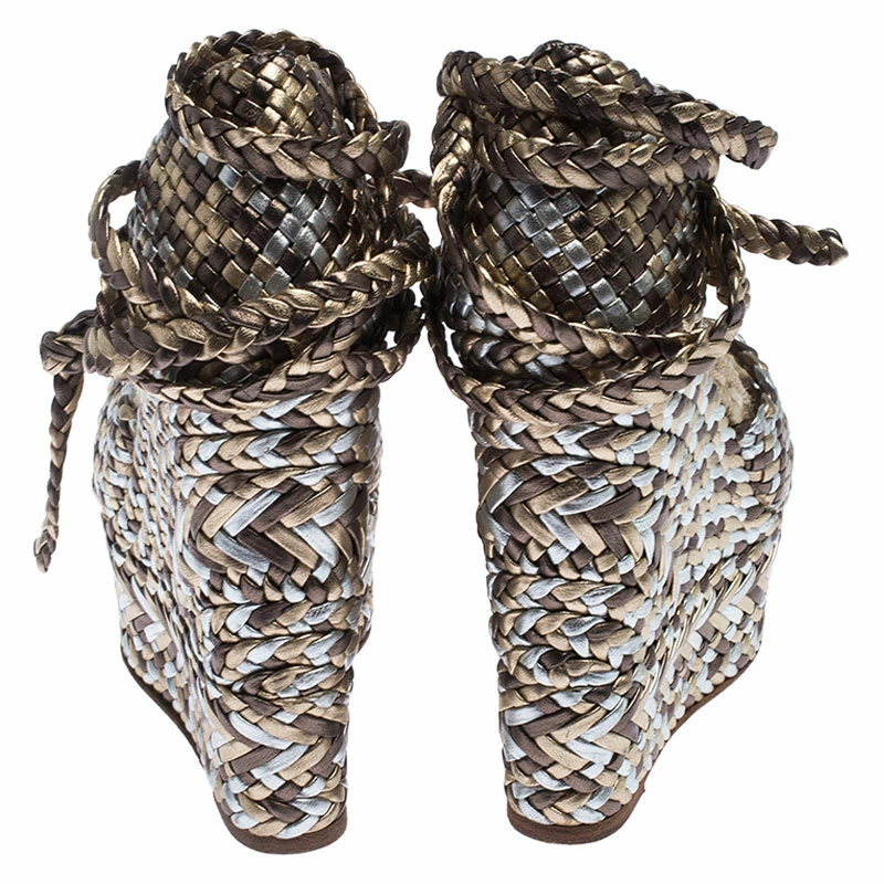 These stunning wedge sandals by Hermes are a must-have. They feature a multicolored exterior of braided leather and raffia. With an open toe silhouette, they feature raised counters with braided ankle straps that give support. The pair is a perfect example of the brand’s exquisite craftsmanship. Wear them with a host of outfits and see how the compliments come pouring in.