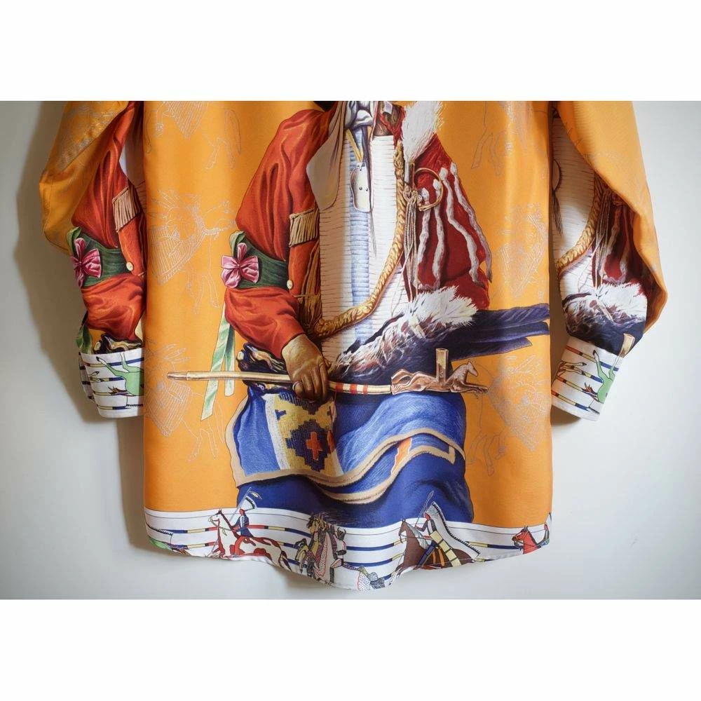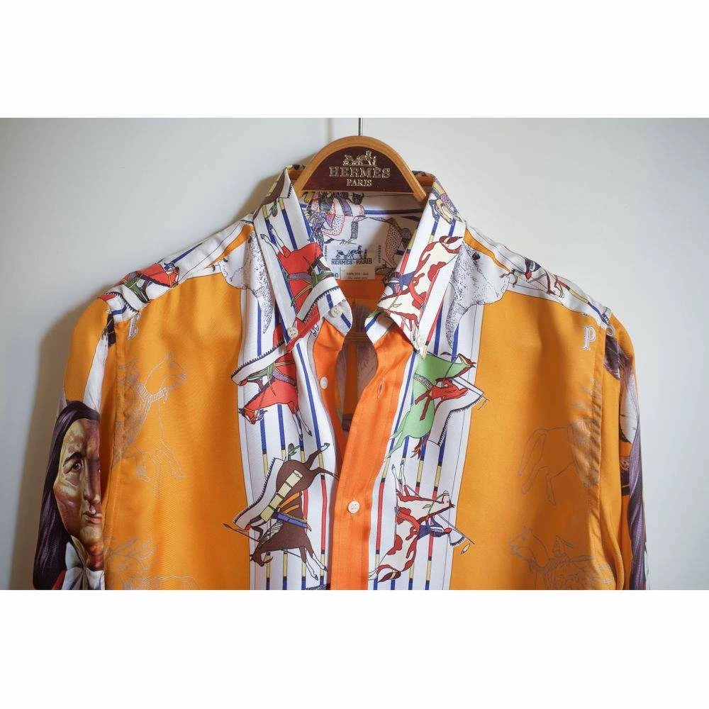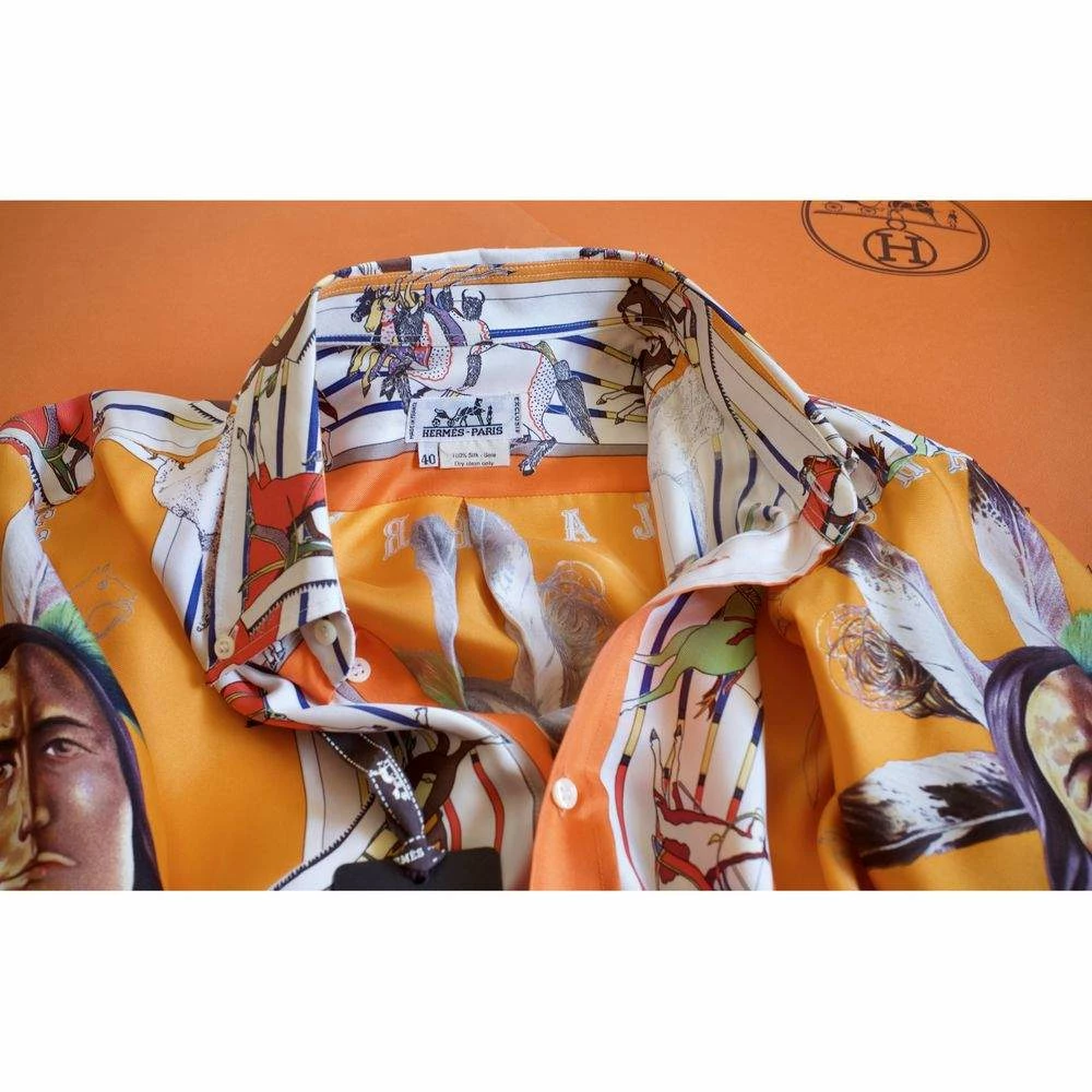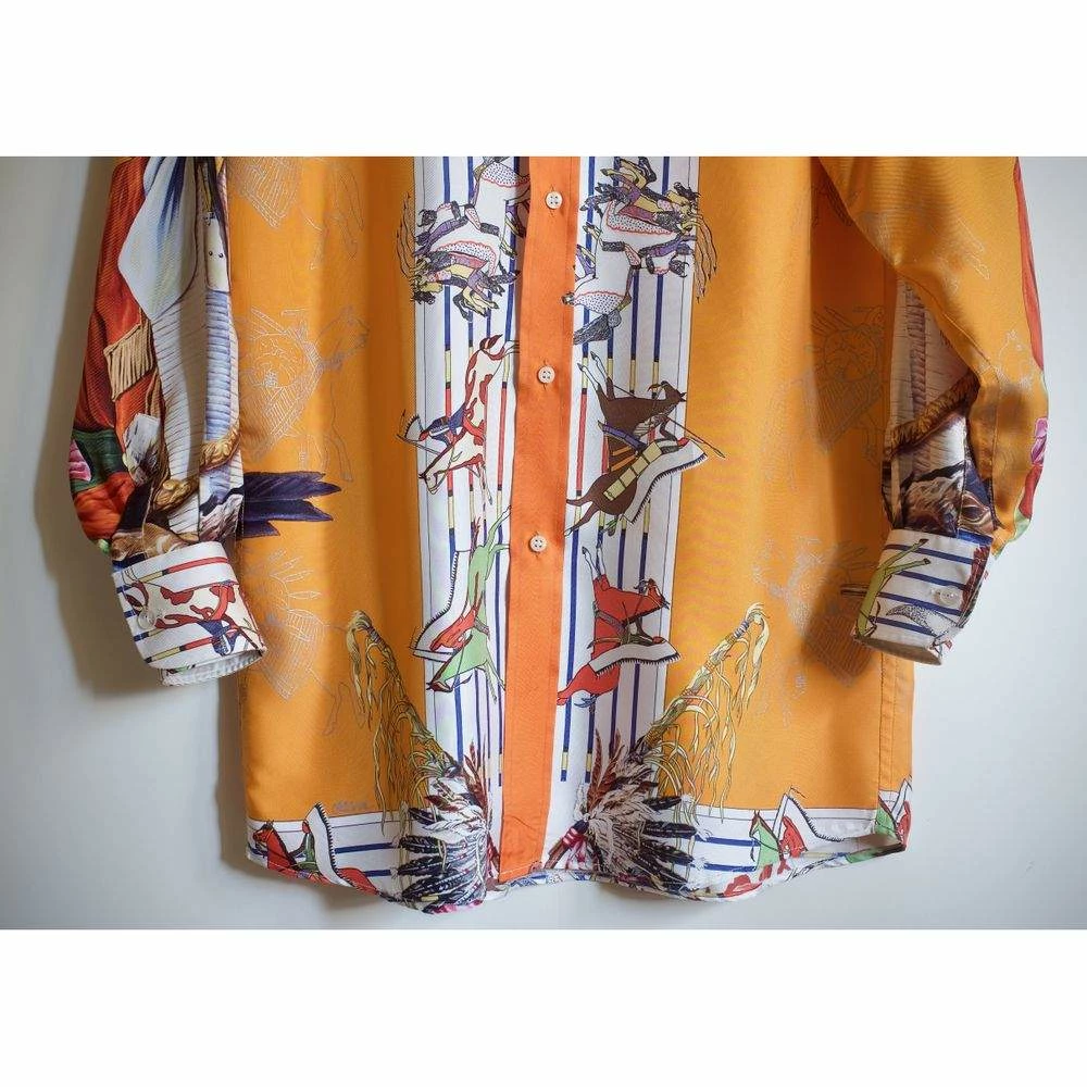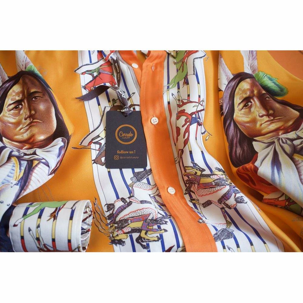 For parties, outings, and playful events, this attractive Hermes Camicia shirt is a fabulous option. Made from premium silk, this multicolor piece features the famous Foulard motif “Pani La Shar Pawnee” designed by Master Oliver Kermit.
